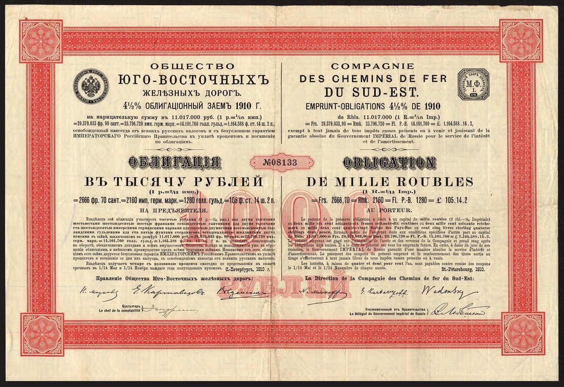 Chemin de Fer du Sud-Est, 4½% Loan, 1910, bond for 1000 roubles, ornate border, red and black, text in Russian and French, with coupons, very fine and scarce internal issue.