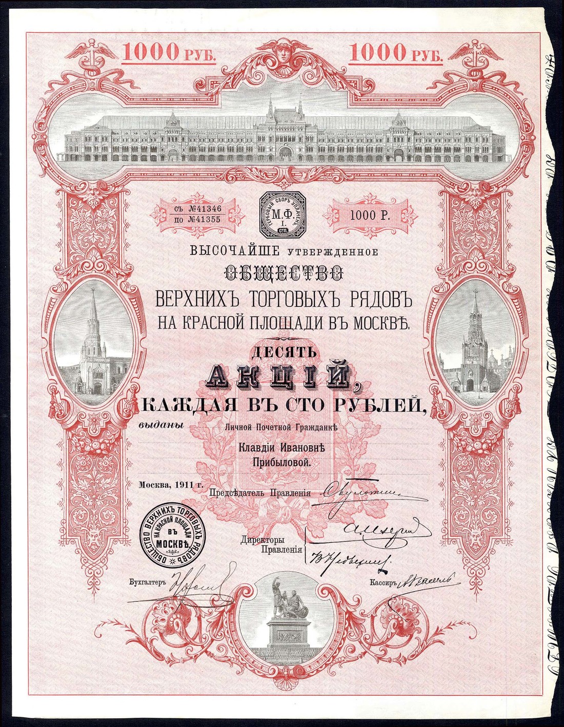 Society of Upper Trading Rows on Red Square in Moscow (GUM), certificate for 10 shares of 100 roubles, Moscow 1911, no.41346-41355, beautiful certificate with vignette of the stores at top, Moscow churches at left and right, statue of Kuzma Minin and Dmitry Pozharsky at bottom, red and black, text all in cyrillic, with coupons, about extremely fine and a scarce denomination.
