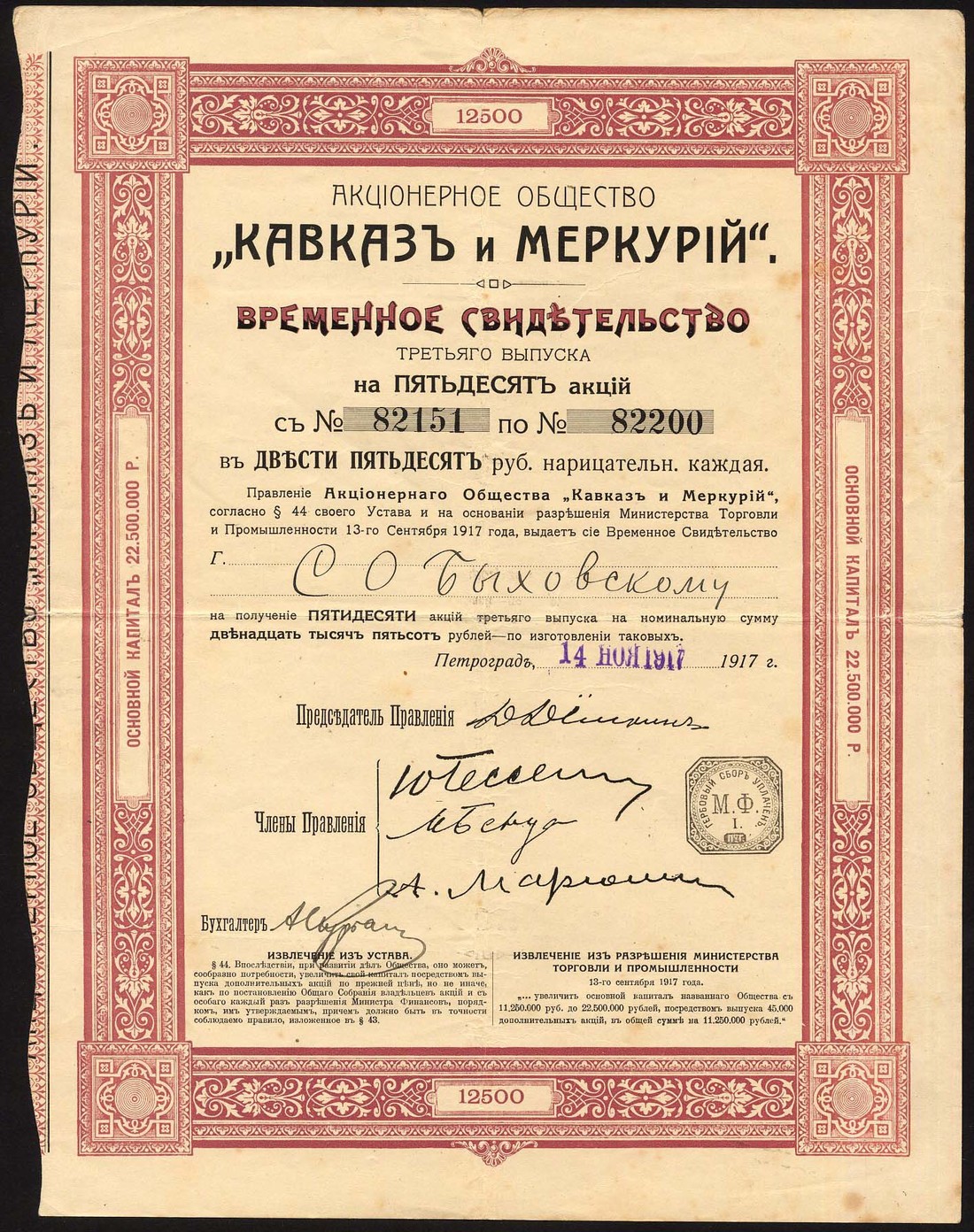 "Kavkas and Mercury" Trading Company, provisional registered certificate for 50 shares of 250 roubles, 1917, no.82151-82200, ornate border, red and black, text all in Russian, heavy folds, fine to very fine and rare.
