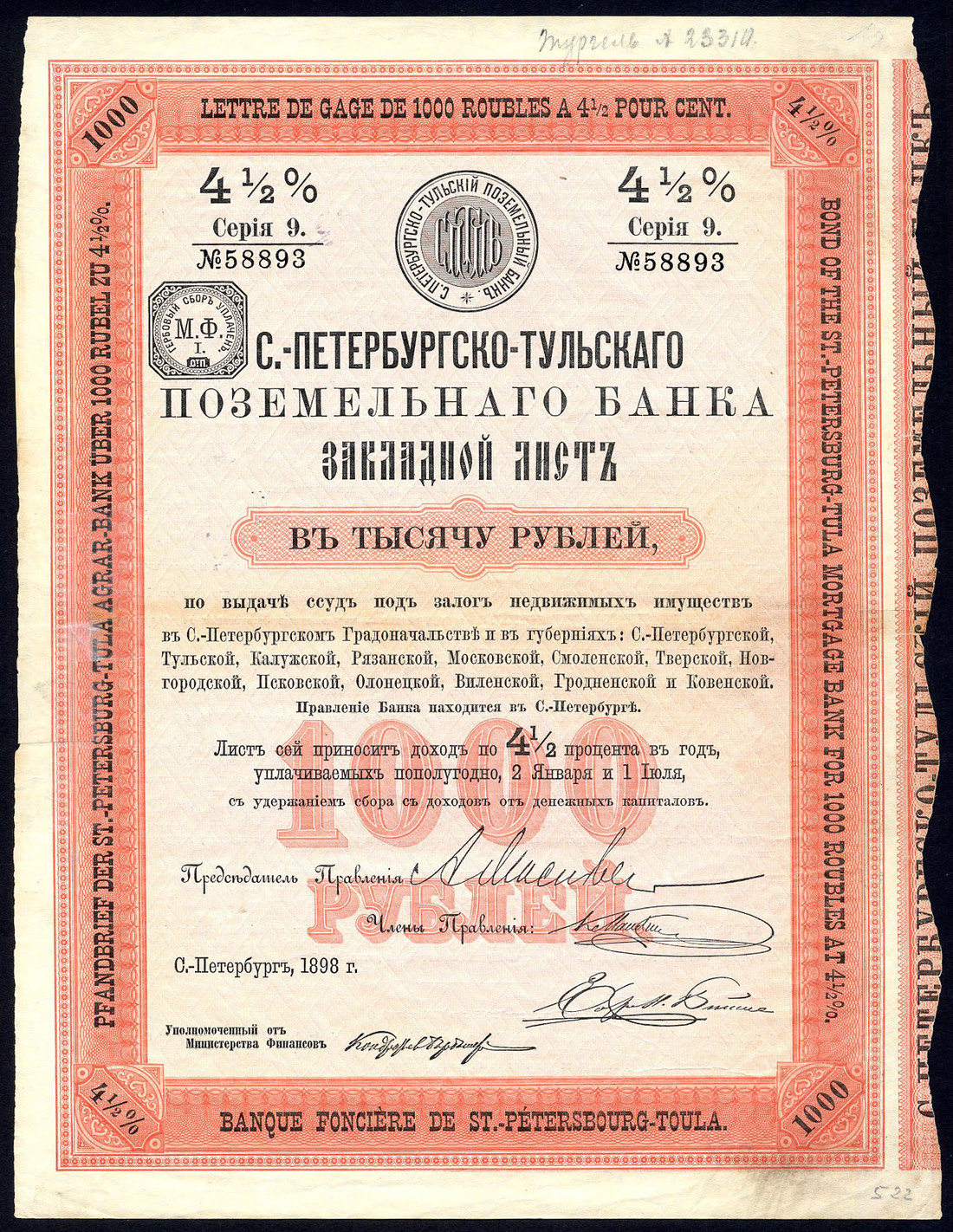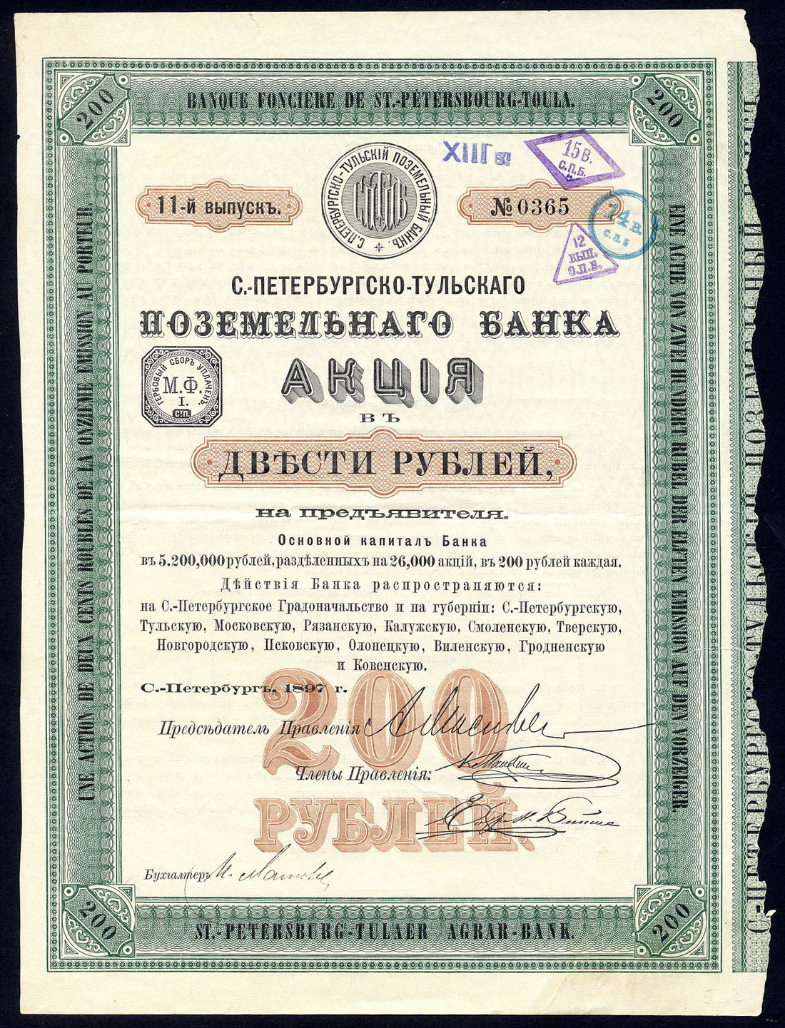 St.Petersburg-Tula Mortgage Bank, 200 rouble share, 11 series, 1897, no.0365, ornate border, green, brown and black, lacks coupons, together with 4½% mortgage bond, series 9, 1000 roubles, 1898, ornate border, red and black, both with minor repairs on reverse, the latter with very neat repair at left, replacing small loss of paper, also lacks coupons, fine to very fine. (2)