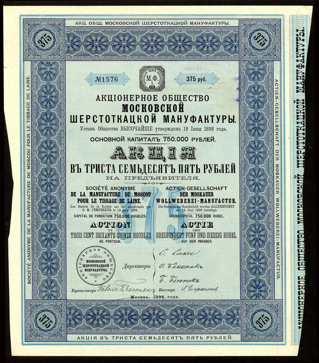 S.A. de la Manufacture de Moscou pour le Tissage de Laine, a group of 9 certificates for 375 rouble shares, Moscow 1898, ornate border, blue and black, 2000 issued, no coupons remain, mixed condition, some with edge nicks and creases, some very fine. (9)