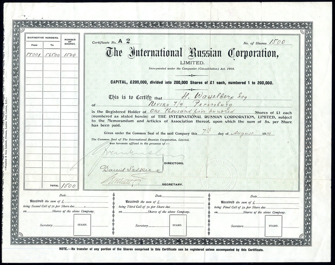 International Russian Corporation, £1 shares, 19[14], no.A2, ornate border, black, green underprint, printed by Waterlow & Sons, fine to very fine.
