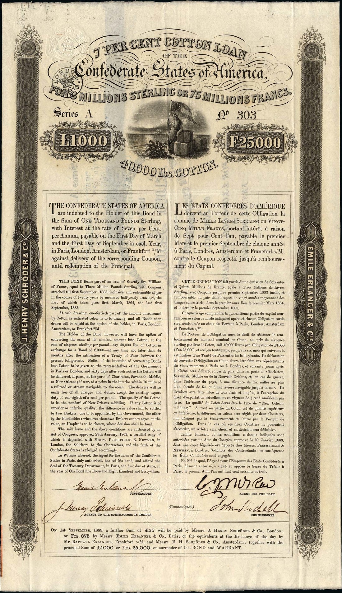 Act of January 29th 1863, 7% Cotton Loan, bond for £1000 or F25,000, no.A303, signed by Emile Erlanger & Co. as contractors, allegorical female with flag and bales, text in English and French, black, grey-brown underprint to coupons (Ball 159), very fine.
