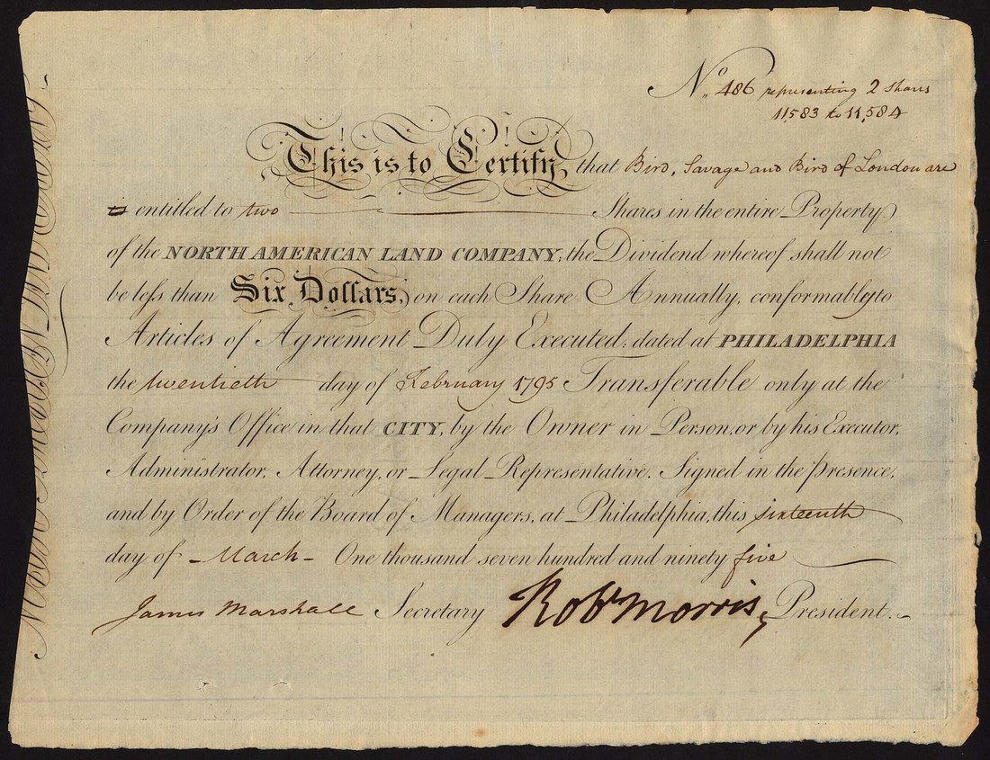 (x) North American Land Company, certificate for [2] shares, 179[5], no.486, signed by Robert Morris as President, black printing with scrollwork at left, a good signature with negligible ink burning, good very fine.