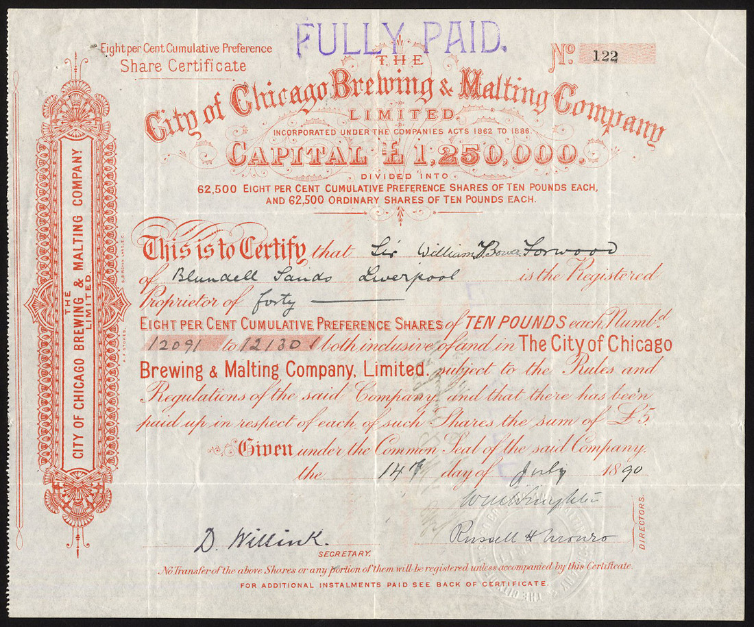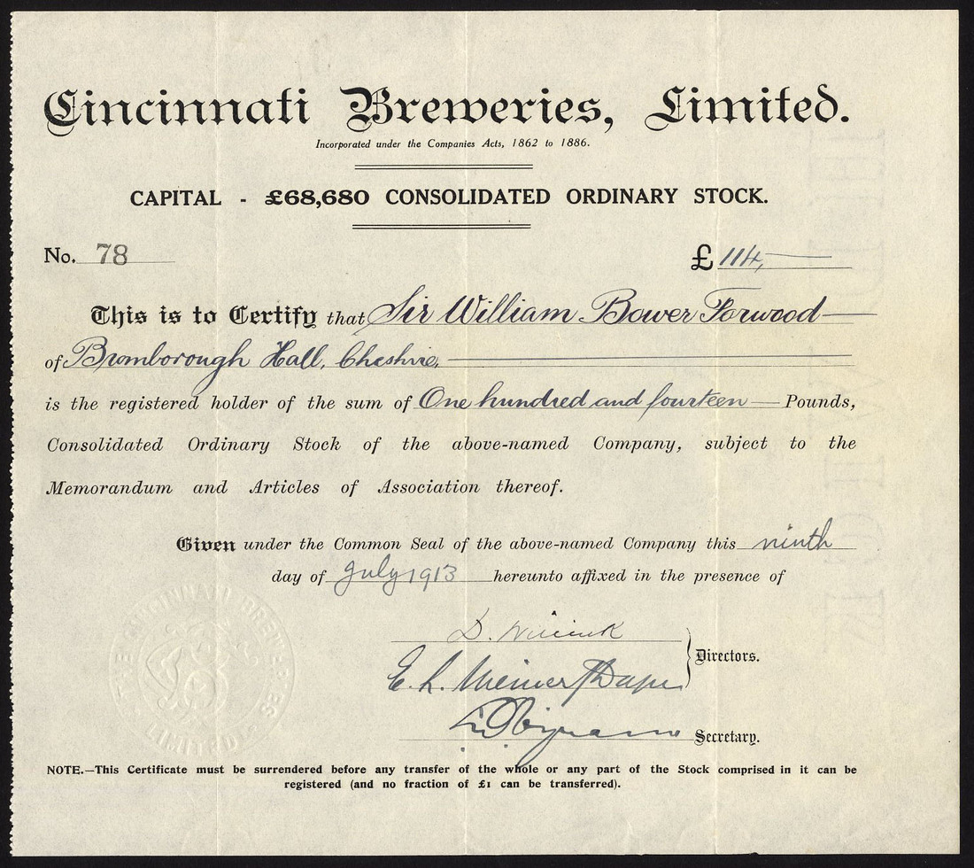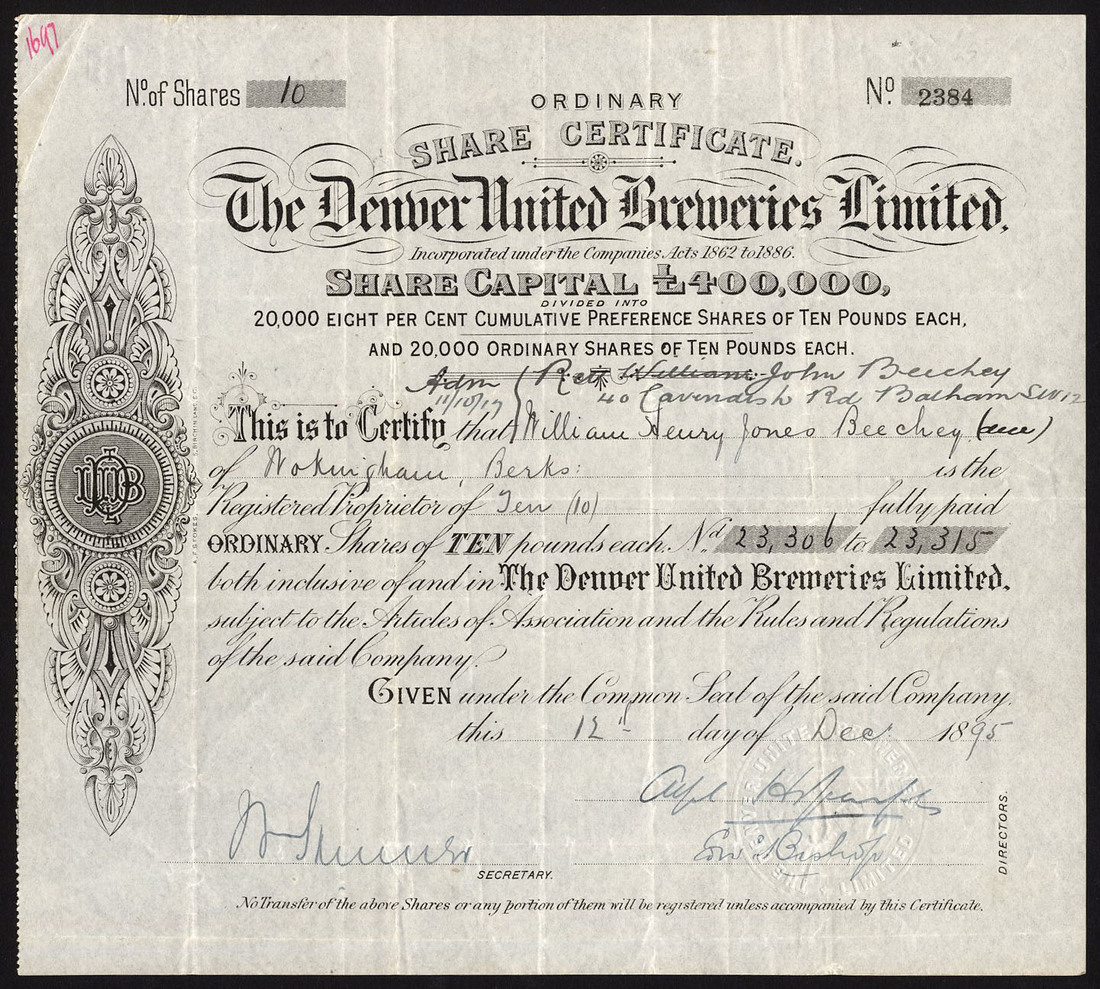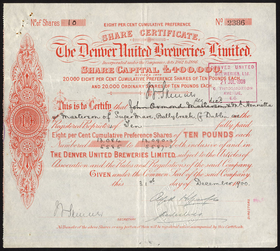 A goup of British companies operating Breweries in the United States, comprising Denver United Breweries Ltd., £10 ordinary shares, 1890 to 1909, 5 examples, 2 types; £10 preference shares, 18[900] and 19[09]; City of Chicago Brewing & Malting Co. Ltd., £10 preference shares, 18[90] and 19[26], and Cincinnati Breweries Ltd., ordinary stock, [1913], fine to very fine. (10)
