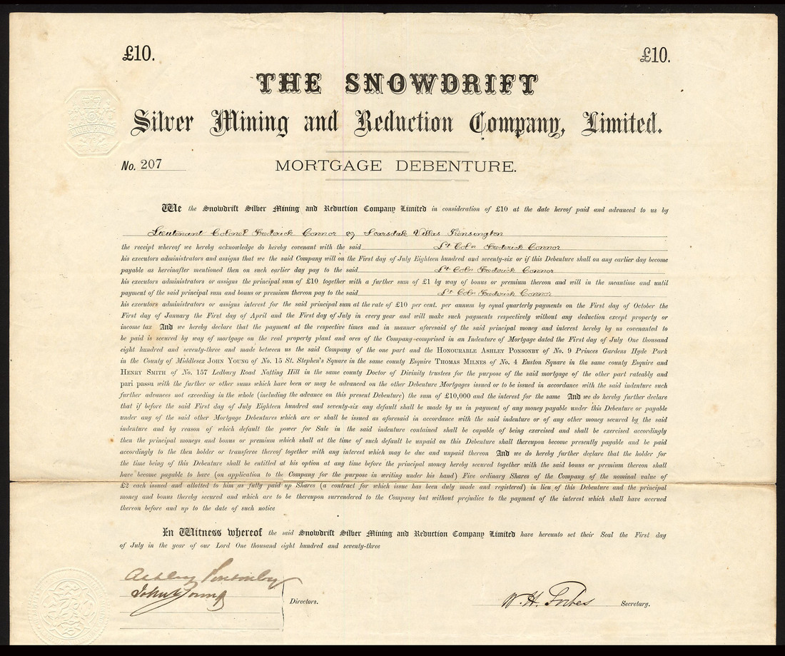 Snowdrift Silver Mining and Reduction Company Ltd., a group of 6 mortgage debentures for £10, 1873, very large format piece, plain black printing, with coupons, fine to very fine. (6)