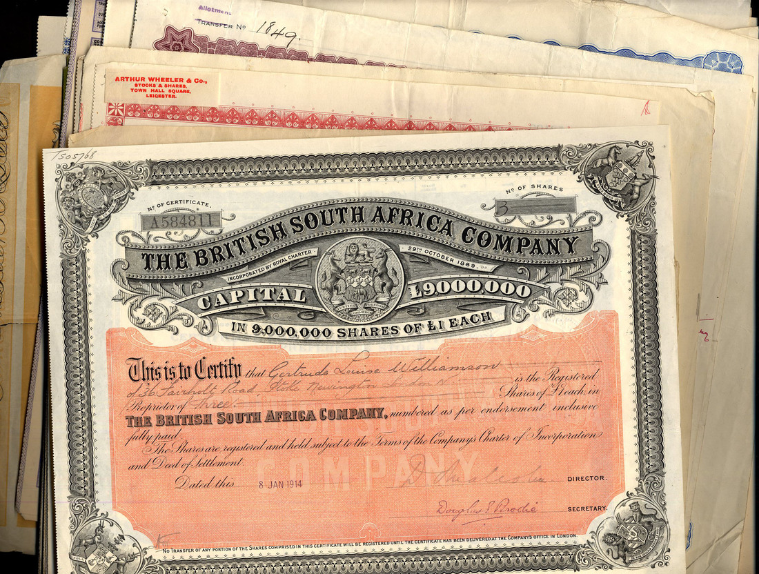 A miscellaneous accumulation of certificates from many countries, including British South Africa Co., £1 shares, [1914], capital £9 million; Cable and Wireless (Holding) Ltd., preference stock certificates (2), 19[44], blue, Waterlow printing; Pioneer Oilfields Ltd., 19[13]; Boulder-London Gold, Land and Oil Development Co., 190[3]; Canadian Lorrain Silver Mines, Ltd., [1926], 33 examples, and Porcupine-Davidson Gold Mines Ltd., 19[23], 36 examples, 2 types, other countries include Russia, Mexico, Great Britain and Malaya, mixed condition but many very fine and some extremely fine. (117)
