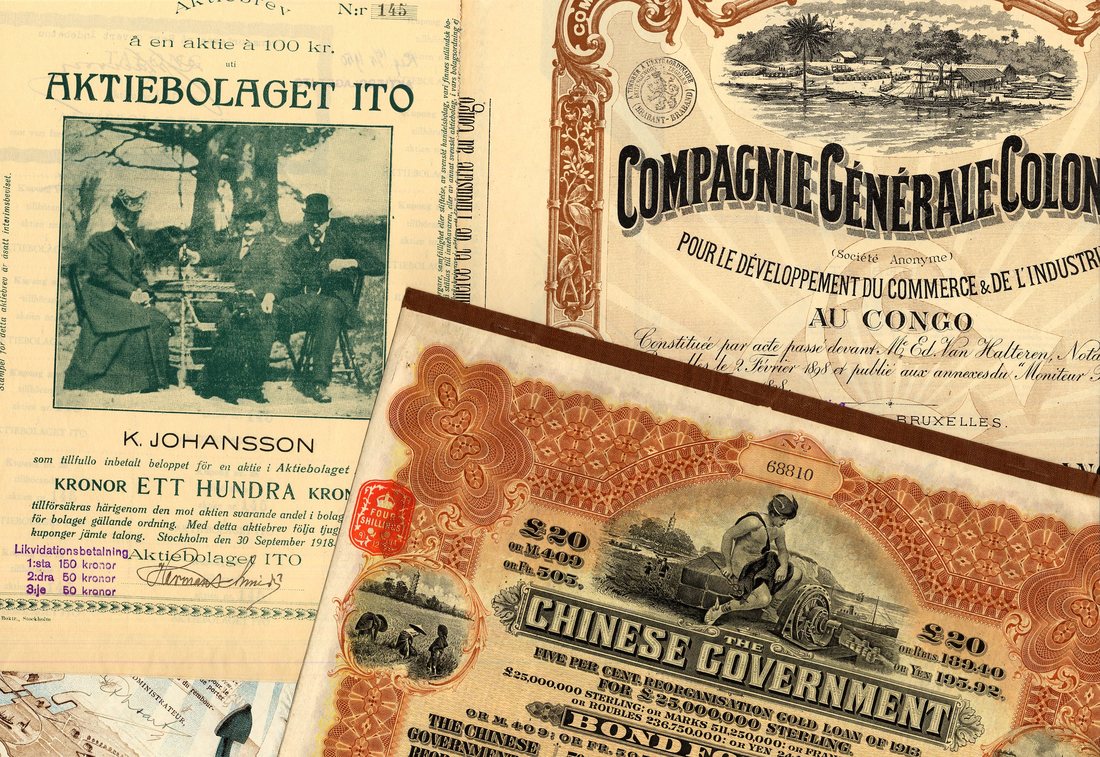A Miscellaneous collection of Bonds from many countries, includes, China, 5% Reorganisation Loan, 1913, £20, Hongkong & Shanghai Bank; Congo, Cie Generale Coloniale, pair of certificates for founders share and 100 franc ordinary share, 1898; Sweden, Aktiebolaget Ito, 100 kroner share, Stockholm 1918, photographic vignette; Cie des Installations Maritimes de Bruges, 500 franc bond, 1909, extremely attractive and well known piece without any cancellation holes; Spain, S.A. Astilleros de Tarragona, Barcelona 1918, huge vignette of early shipping; Poland, Bank Przemyslowcow, 1920, 2 examples; Soc. des Telephones Ericsson, founders share; Banque Industrielle de Chine, 2 examples, and others (34), and Port of Para, 1 ordinary share (18 examples) and one preferred share (18 examples), a little duplication, a handful are cancelled, mixed condition but many very fine and better. (81)