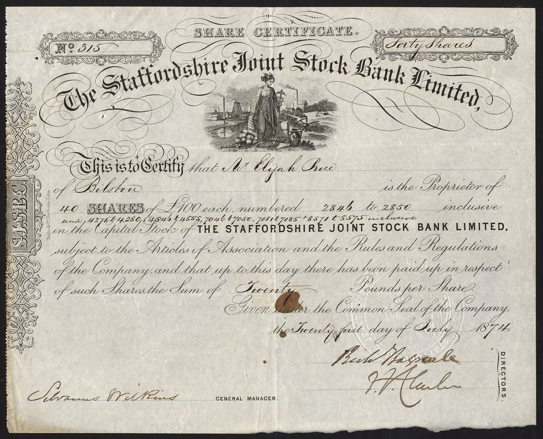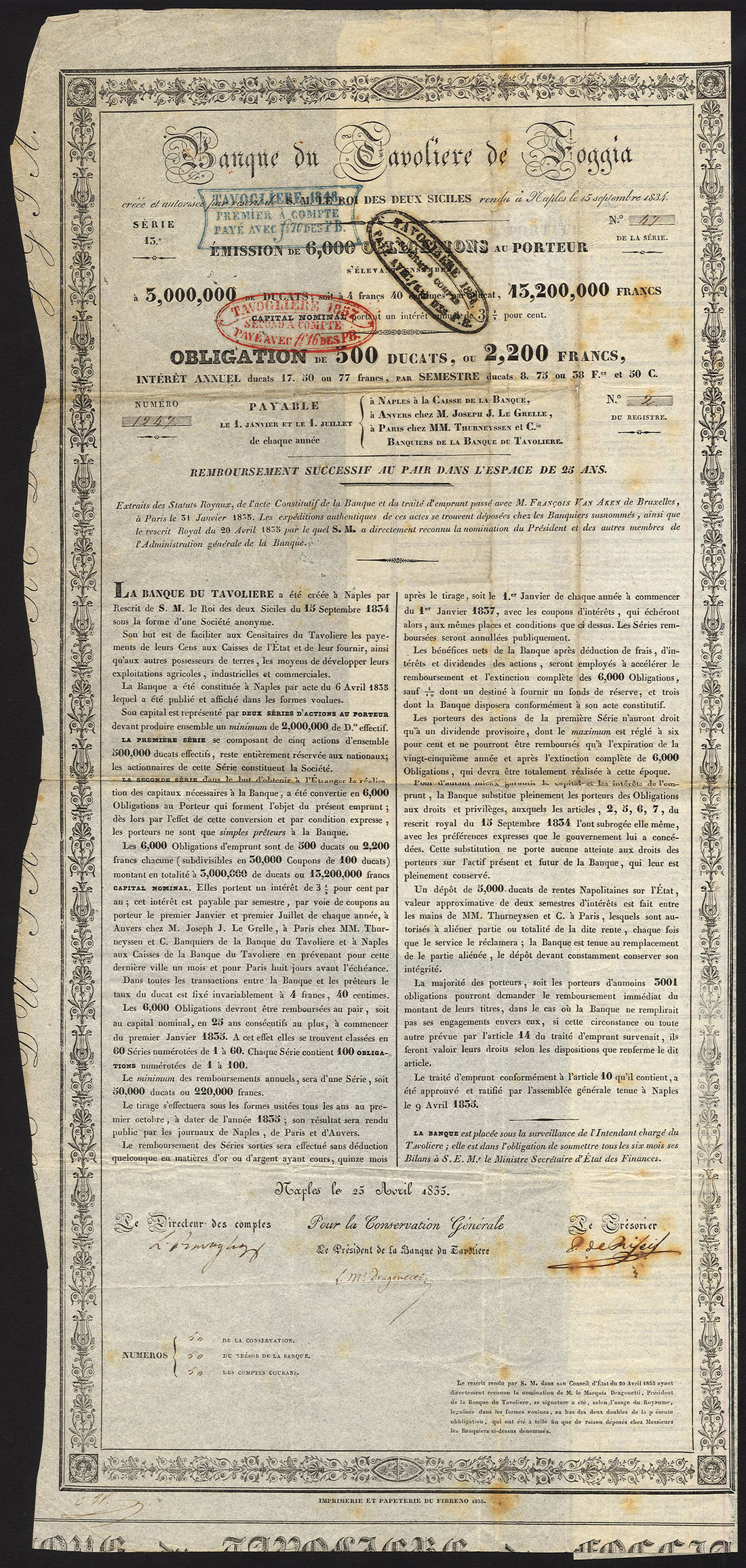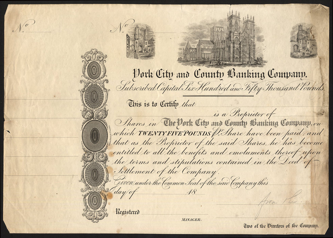 A worldwide selection of Banking and Insurance Companies comprising Staffordshire Joint Stock Bank Ltd., 2 types, 1874 and 1884, the first with vignette of allegorical figure; York City and County Banking Company, a proof certificate, circa 1860 printed by Perkins, Bacon & Co., vignettes of York Minster and gates of the City; People's Trust Company Ltd., a specimen £10 debenture from the Bradbury, Wilkinson & Co. archive, 1914, steam train, steamship, mine and ironworks vignettes; Italy, Banque du Tavoliere de Foggia, 500 ducat bond, Naples 1835; Banco Popular del Peru, a specimen 8% mortgage bond for 100 libras from the ABNCo. archive, circa 1910 and South Africa, Cape Commercial Bank, £12 share, 1854, and others (9), a few with condition problems but well worth inspection, fine to very fine. (15)