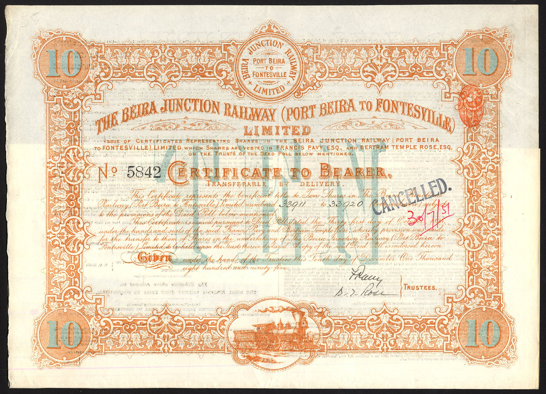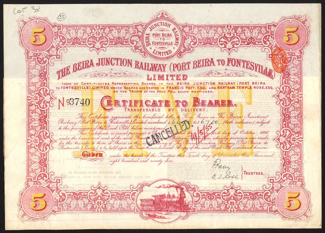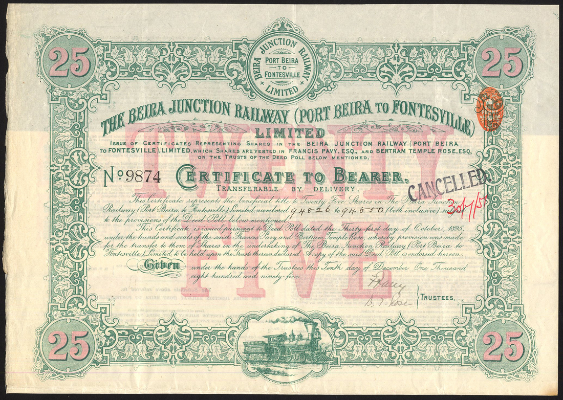 Mozambique: Beira Junction Railway (Port Beira to Fontesville) Ltd., a set of bearer certificates for 5, 10 and 25 shares of £1, 1895, numbers 3740, 5842 and 9874, ornate borders with steam train at bottom, red, orange-brown and green respectively, with coupons, stamped cancelled, all in the 1950's, the first slightly trimmed otherwise about extremely fine. (3)