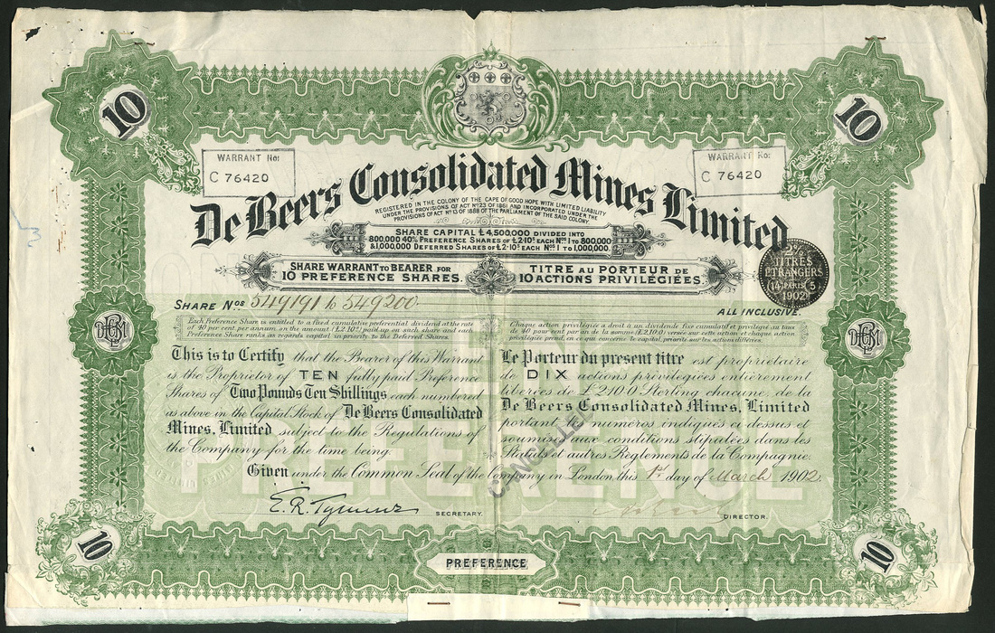 South Africa: De Beers Consolidated Mines Ltd., share warrant for 10 shares of £2 10s, 190[2], no.C76420, signed by Alfred Beit as Director, ornate border, green and black, no coupons, together with similar certificates for 1 share and 5 shares signed by other directors, 190[2] and 190[4], other bearer shares of West Rand Consolidated Mines Ltd., 1930's, 5 different types, Durban Roodepoort Deep Ltd., 5 shares, 189[5], and 1 and 25 shares, 1930's, and Diamond mining certificates (4) comprising Consolidated Diamond Mines of South West Africa Ltd., 1949 and 1958, Premier (Transvaal) Diamond Mining Co. Ltd., 1951 and 1957, generally fine to very fine and better. (15)