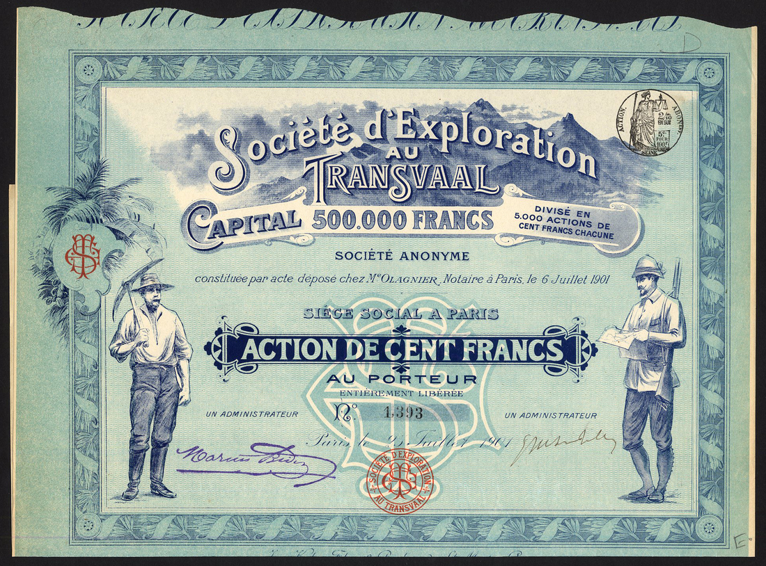 South Africa: Soc. d'Exploration au Transvaal, 100 franc share, Paris 1901, no.1393, mountain range behind title, miner at left, European gentleman at right, blue, with coupons, extremely fine.