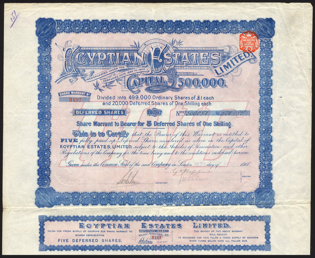 Egyptian Estates Ltd., bearer warrant for 5 deferred shares of 1 shilling, 190[5], two examples, numbered B169 and B197. ornate border, blue, pink underprint, text all in English, with coupons, pinholes, very fine and first time we have seen this new type. (2)