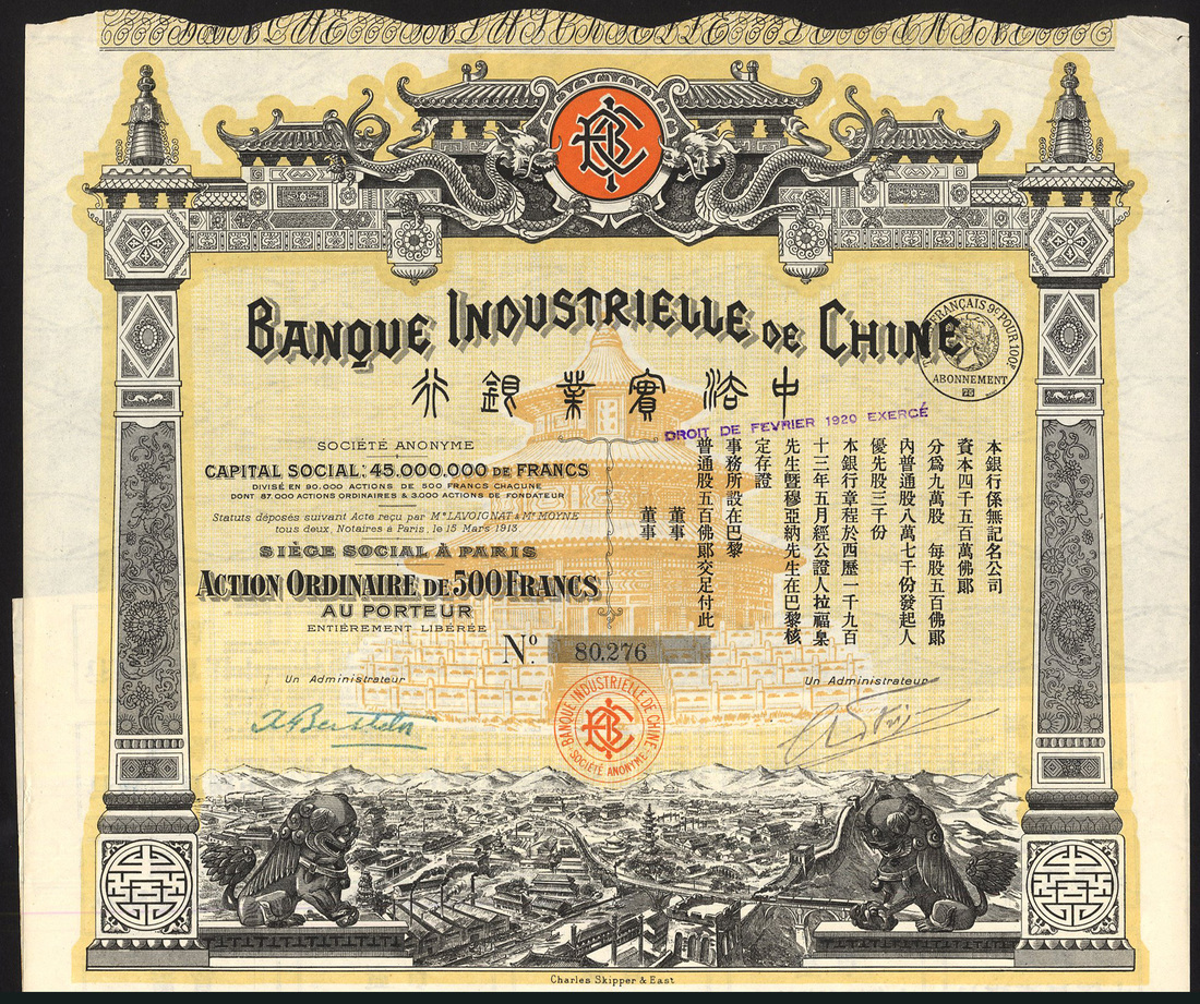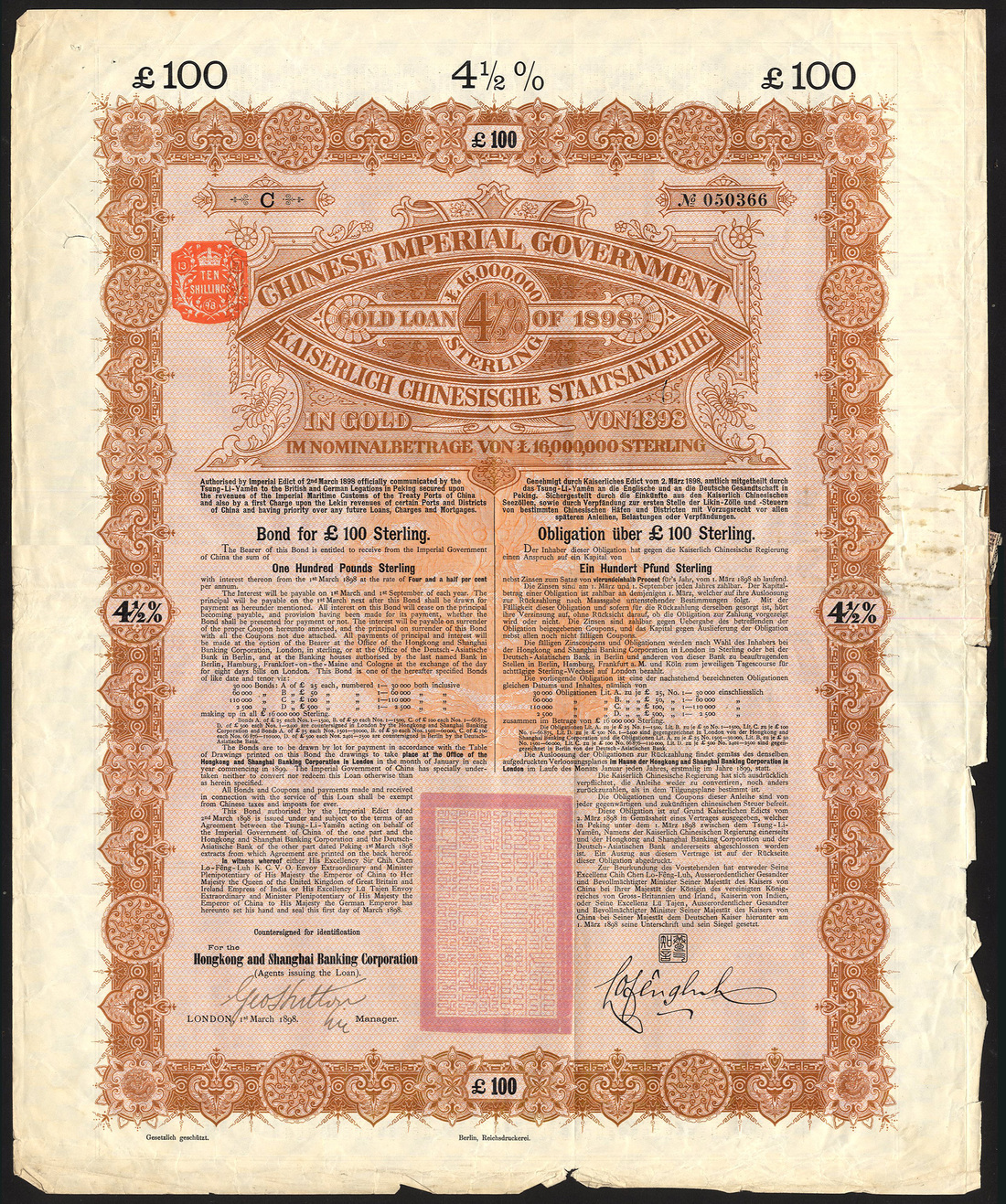 China: A small group of Chinese bonds comprising 1898 Gold Loan, £50, German issue, £100, English issue, Shanghai Nanking Railway. £100, 1904; 1925 Boxer Loan, $50, and Banque Industrielle de Chine, 500 franc share, 1913, capital 45 million, generally very fine. (5)