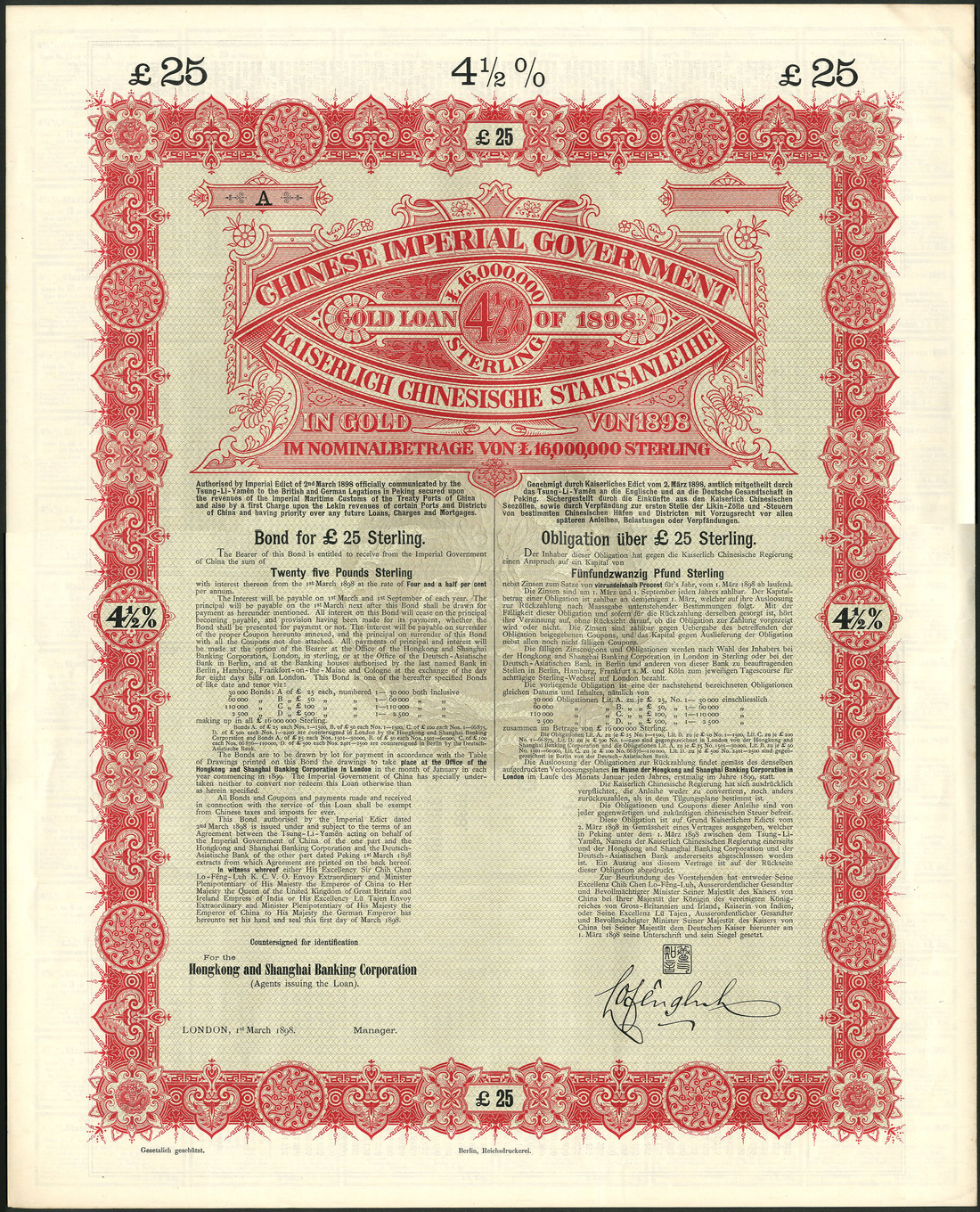 China: 1898 4½% Gold Loan, unissued bond for £25, countersigned by Hongkong and Shanghai Banking Corporation, large format piece, red with multicoloured underprint, with full coupons sheet, extremely fine and extremely rare. [R11]