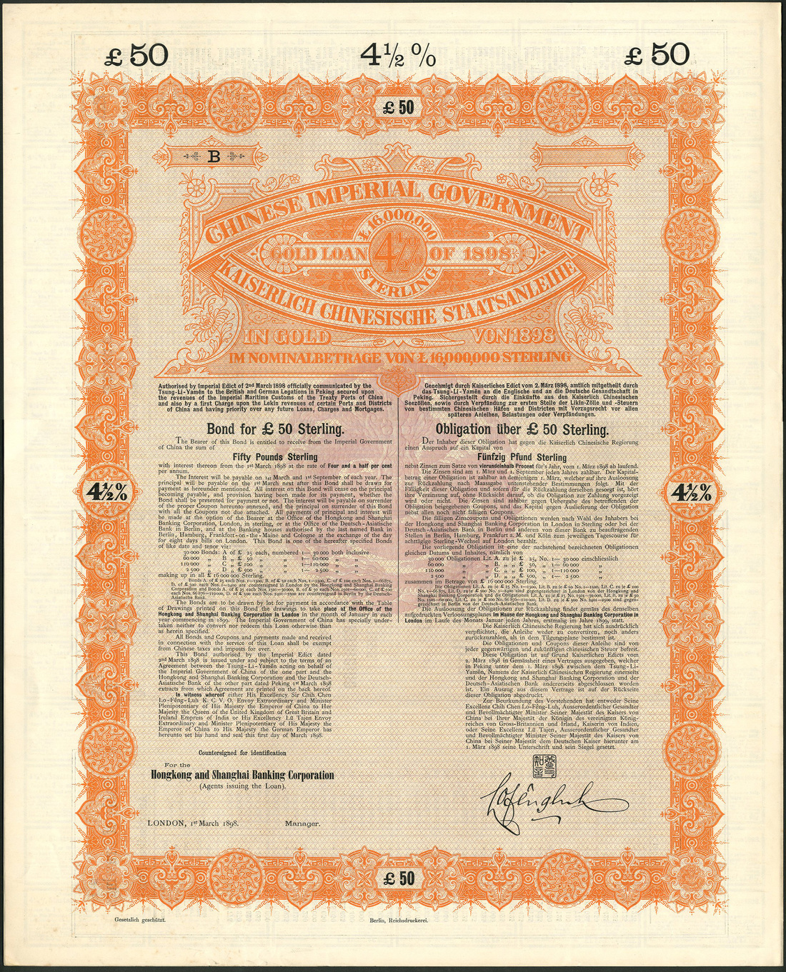 China: 1898 4½% Gold Loan, unissued bond for £50, countersigned by Hongkong and Shanghai Banking Corporation, large format piece, orange with multicoloured underprint, with full coupons sheet, extremely fine and extremely rare. [R11]