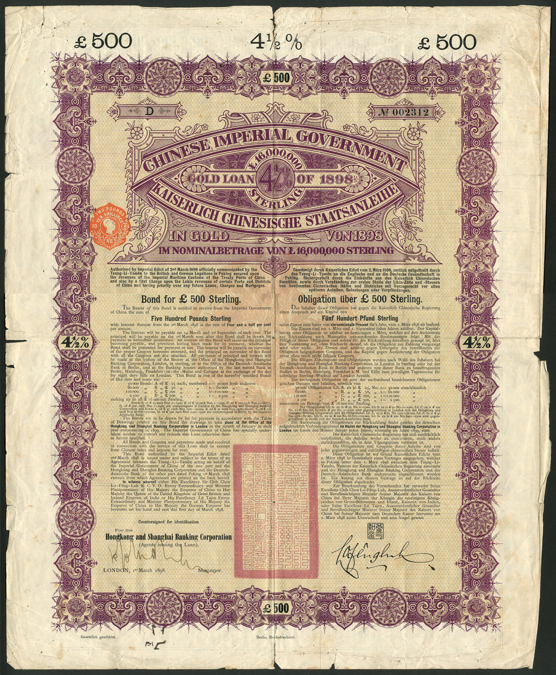 China: 1898, 4½% Gold Loan, £500 bond, no.002312, issued by the Hongkong and Shanghai Banking Corporation, large format, ornate border, mauve and black, red chop in centre, lacking coupons, usual small edge tears, but no paper loss, fine and scarce.