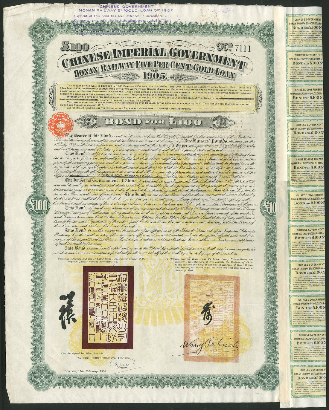 China: 1905 Honan Railway 5% Gold Loan, pair of bonds for £100, first issue no.3577 dated 1905 and second issue no.7111 dated 1906, large format, ornate border, blue-green and black with yellow underprint, both with coupons, a few surface marks on the second but very fine and better. (2)