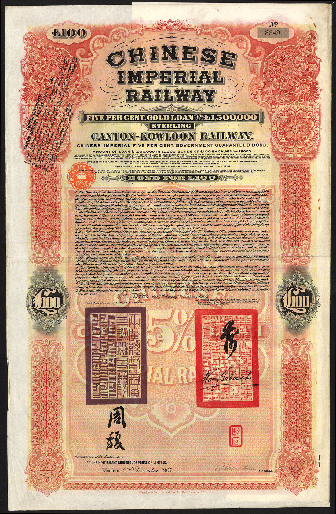 China: Canton Kowloon Railway 5% Loan, 1907, £100 bond, no.8849, large format, red and black, printed by Waterlow & Sons, with coupons, good very fine.