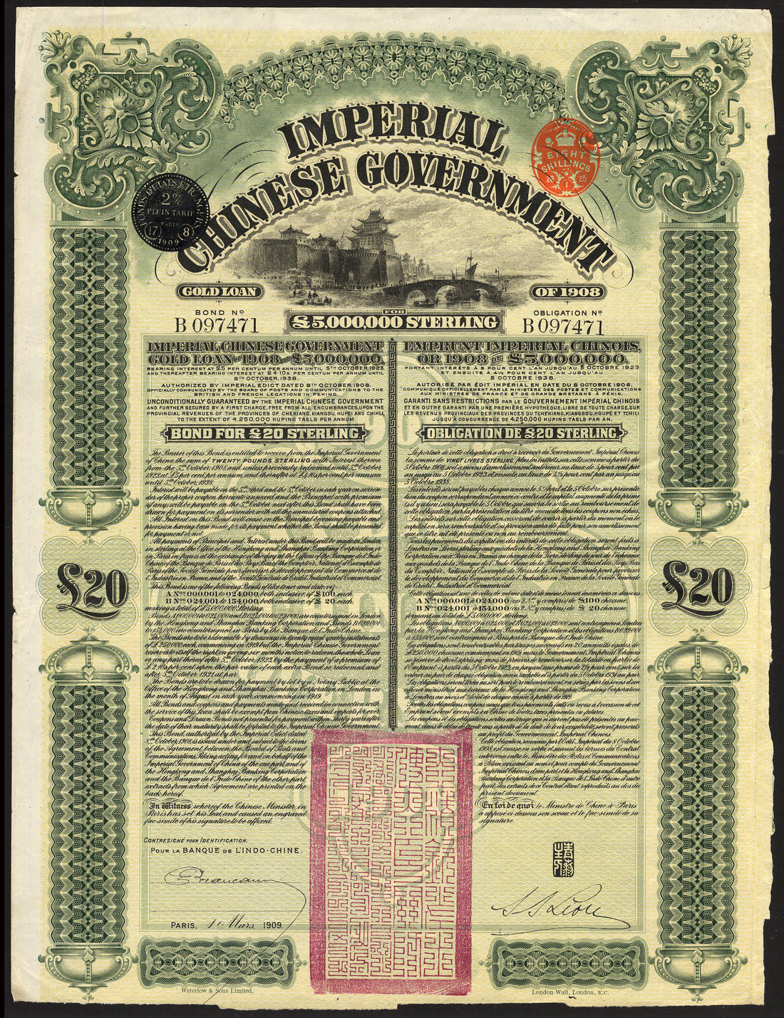 China: 1908 5% Gold Loan, bond for £20 issued by the Banque de L'Indo-Chine in 1909, no.B097471, walled city of Peking at top, green and black, printed by Waterlow & Sons, no coupons remain as usual, very fine to extremely fine and scarce thus