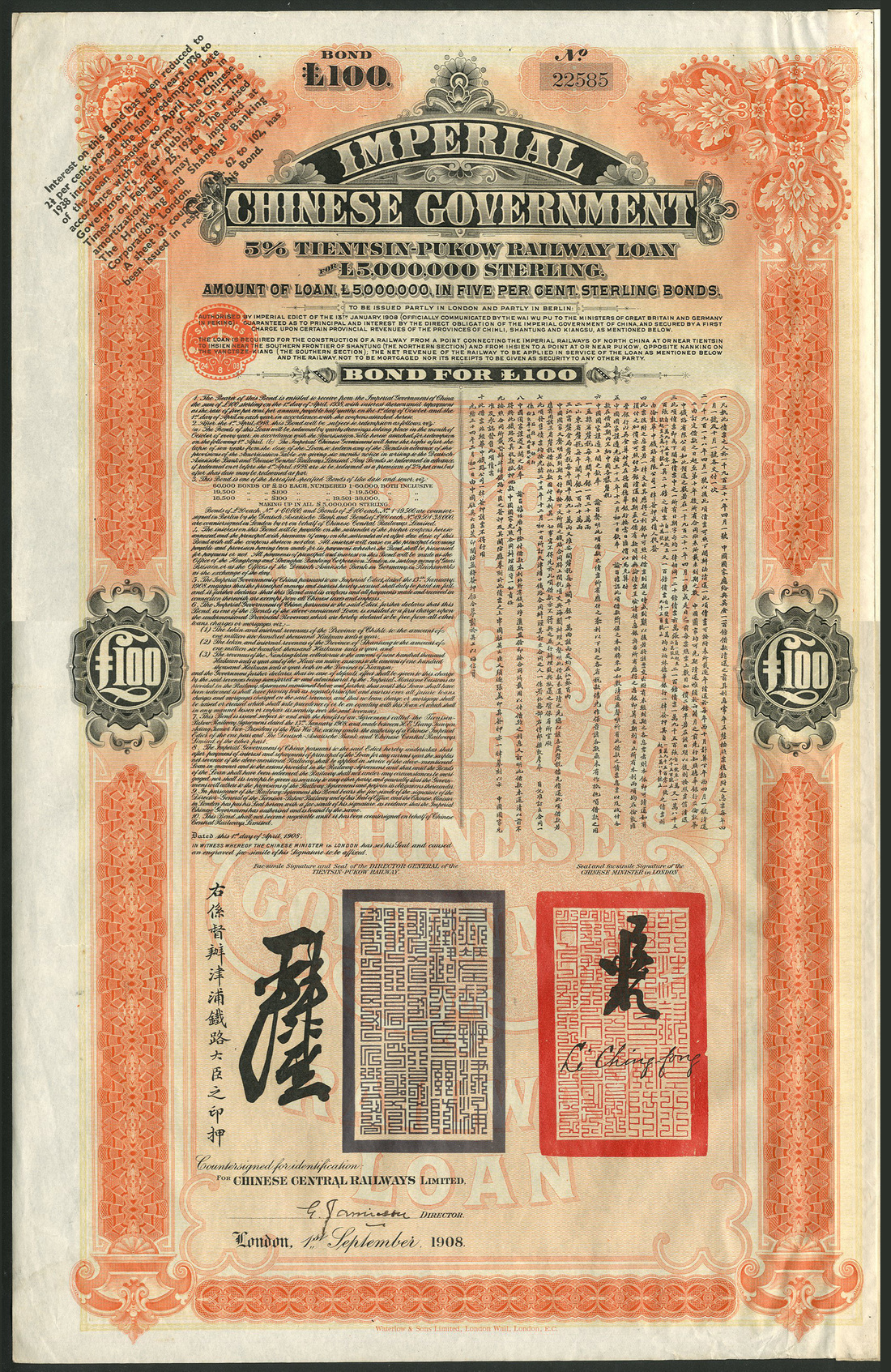 China: 1908 Tientsin Pukow Railway 5% Loan, a group of 5 bonds for £100, issued by Chinese Central Railways Ltd., large format pieces with ornate borders, orange and black, printed by Waterlow & Sons, with coupons, all very fine and better. (5)