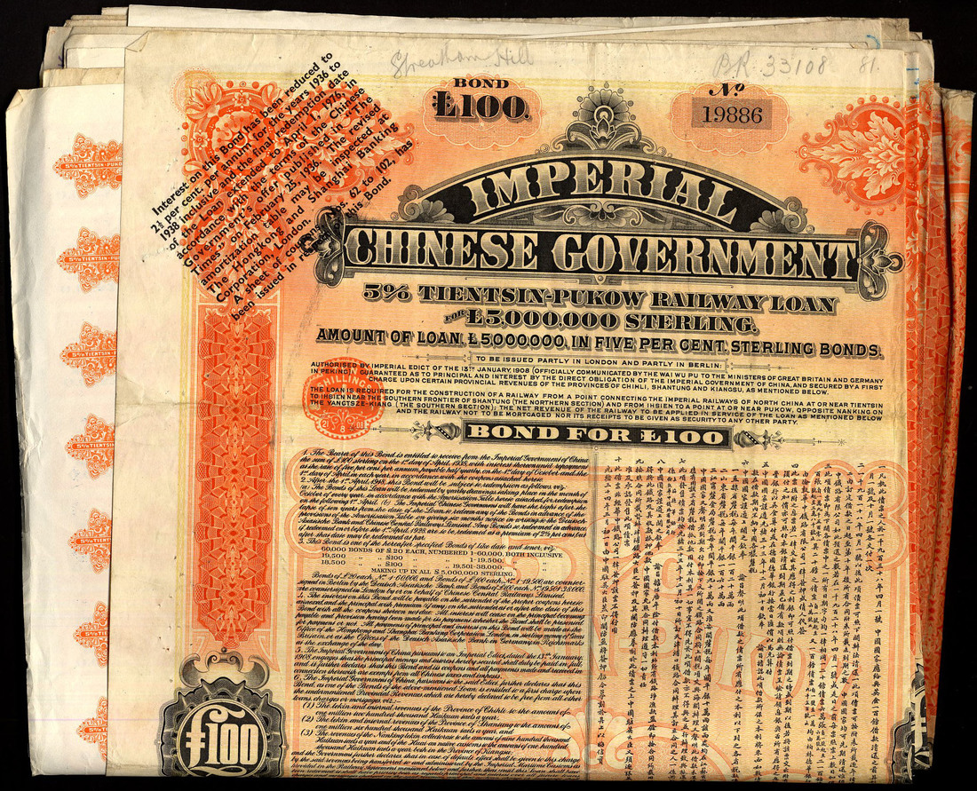 China: 1908 Tientsin Pukow Railway 5% Loan, a group of 8 bonds for £100, issued by Chinese Central Railways Ltd., large format pieces with ornate borders, orange and black, printed by Waterlow & Sons, with coupons, mixed condition, fine to very fine. (8)