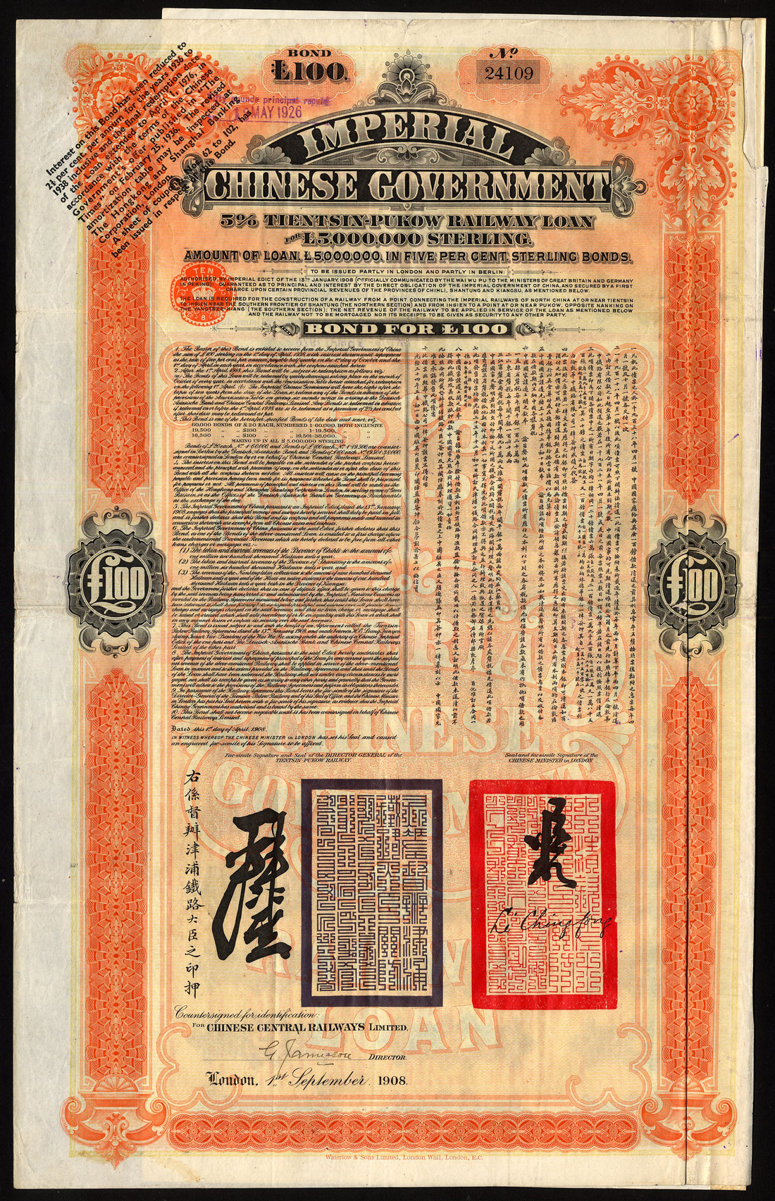 China: 1908 5% Tientsin Pukow Railway Loan, bond for £100, no.24109, issued by Chinese Central Railways Ltd., overstamped with £50 paid in 1926 at top left, large format, ornate border, orange and black, printed by Waterlow & Sons, with coupons, very fine and scarce.