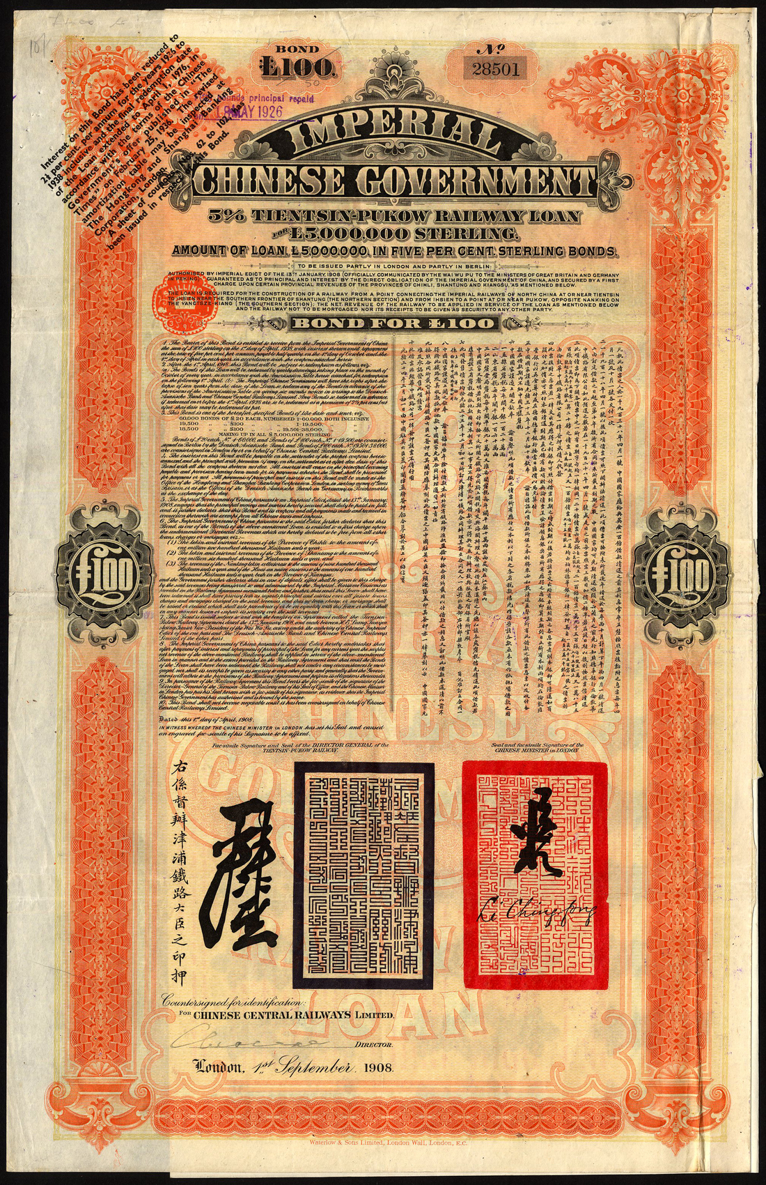 China: 1908 5% Tientsin Pukow Railway Loan, bond for £100, no.28501, issued by Chinese Central Railways Ltd., overstamped with £50 paid in 1926 at top left, large format, ornate border, orange and black, printed by Waterlow & Sons, with coupons, very fine and scarce.