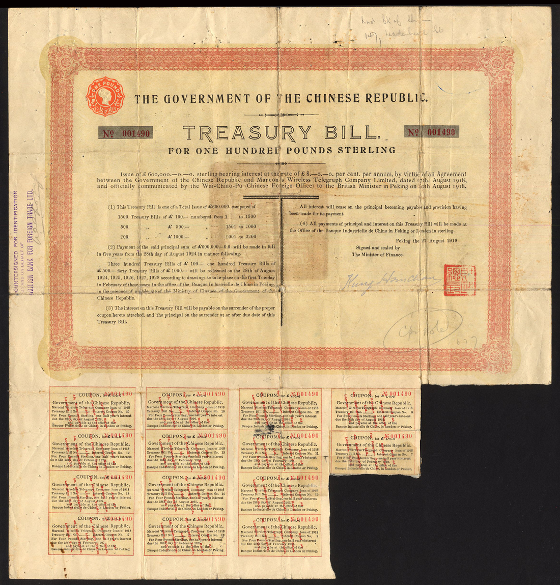 China: 1918 8% Treasury 'Marconi' Bill, bond for £100, no.001490, with original coupons, ornate border, red and black, yellow underprint, on poor quality paper, with coupons, heavy creasing, fine and rare. [R9]