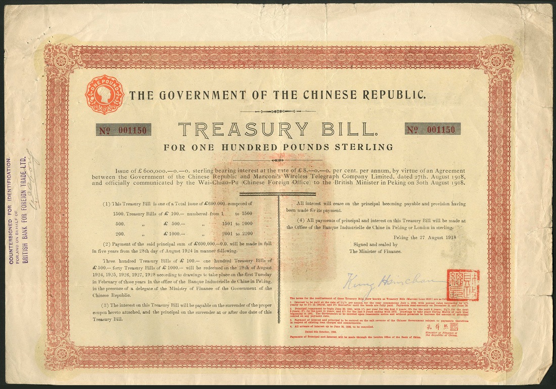 China: 1918, 8% Treasury 'Marconi' Bills, a group of 7 bonds for £100, ornate border, red and black, yellow underprint, on poor quality paper, with coupons, fair to fine. (7)