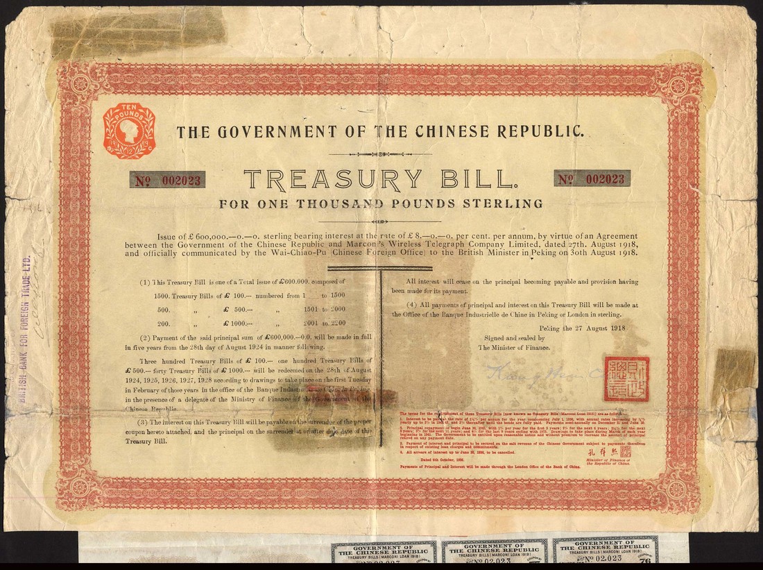 1918 8% Treasury 'Marconi' Bill, a set of bonds for £1000, no.002023, £500, no.001710 and £100, no.000734, ornate borders, red and black, yellow underprint, on poor quality paper, with coupons, the £1000 and £500 with some old repairs, fine, the £100 very fine. (3)