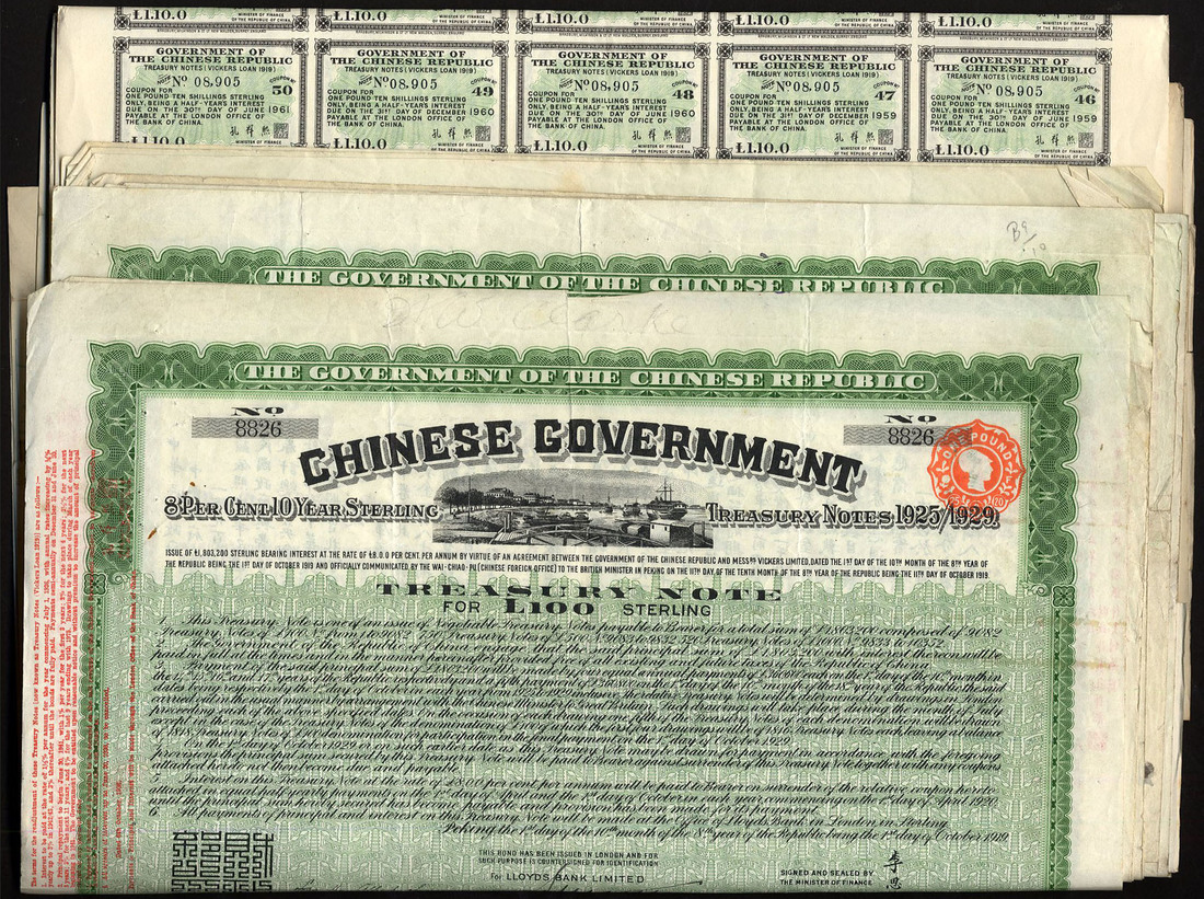 China: 1919 8% 10 Year Sterling Treasury Notes 'Vickers Loan', a group of 16 bonds for £100, vignette of dockside at top, ornate border, green, with coupons, generally very fine. (16)