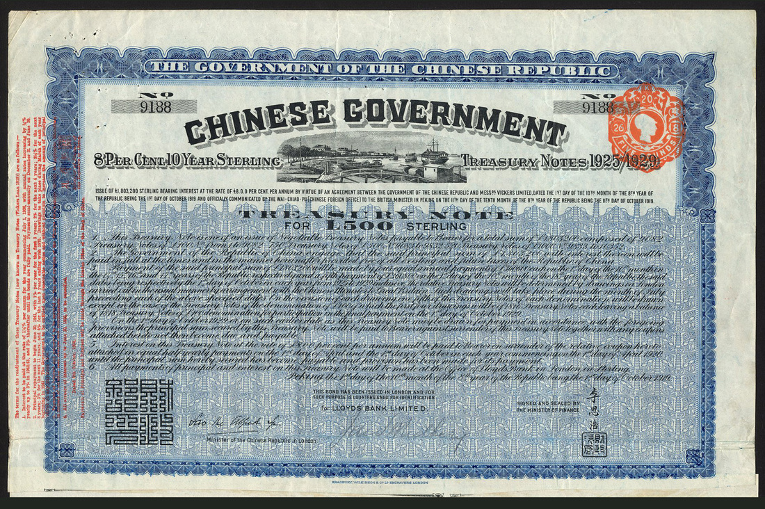 1919 8% 10-Year Sterling Treasury Notes 'Vickers Loan', a pair of bonds for £500, no.9188, and £100, no.6322, dockside vignette, blue and green respectively, with coupons, about very fine.(2)