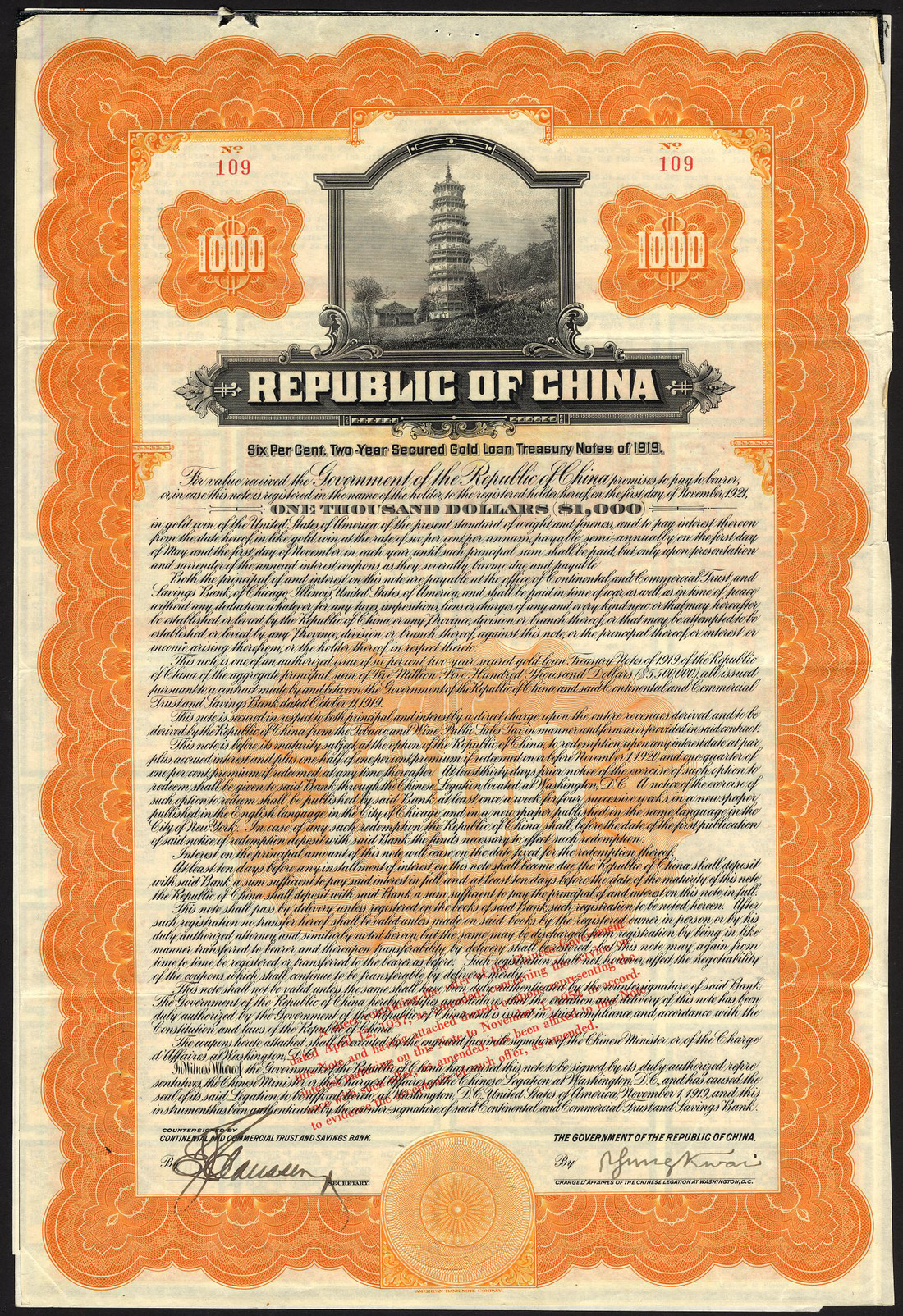 China: 1919, 6% Two-Year Secured Gold 'Chicago Bank' Loan, $1000 bond, no.109, vignette of Pagoda at top, orange and black, printed by the American Bank Note Co., with coupons, good very fine but small split from staple at top edge. [R6*]