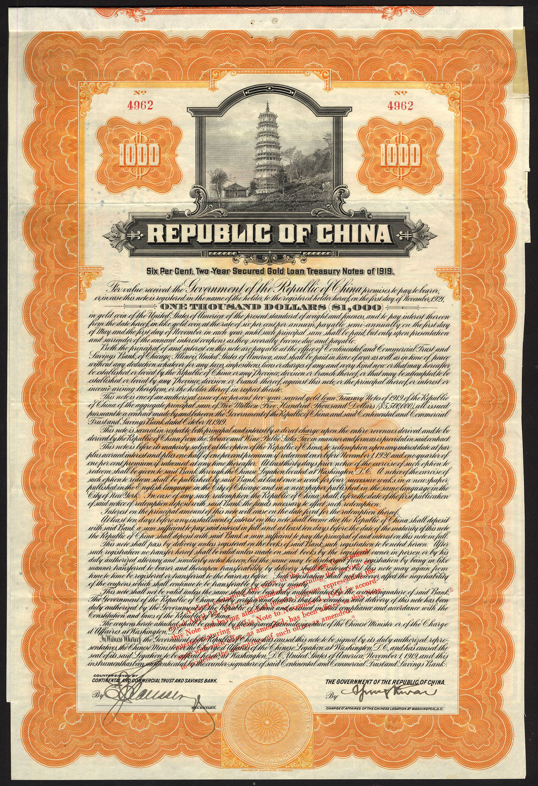China: 1919, 6% Two-Year Secured Gold 'Chicago Bank' Loan, $1000 bond, no.4962, vignette of Pagoda at top, orange and black, printed by the American Bank Note Co., with coupons, good very fine. [R6*]