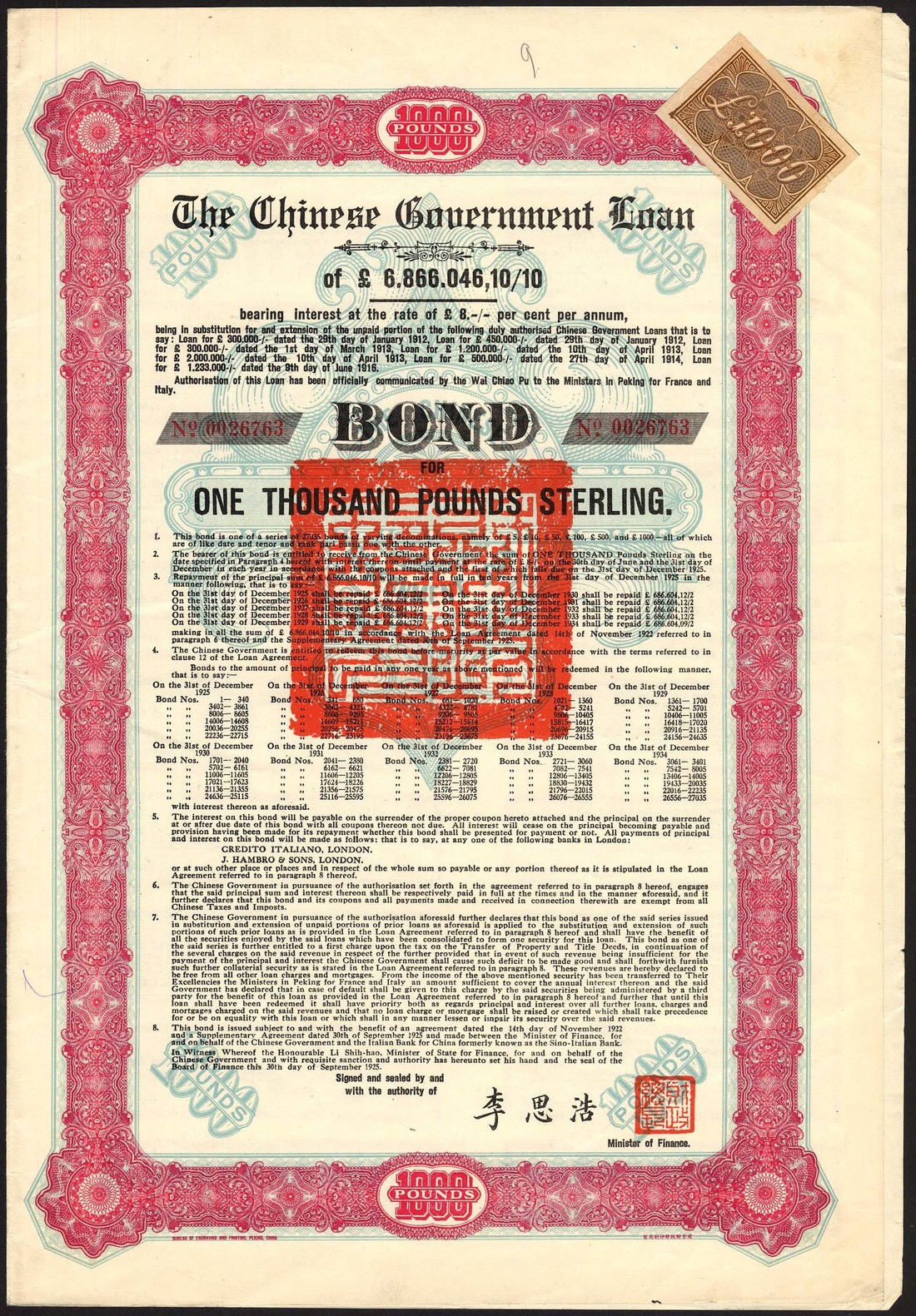 China: 1925 8% 'Skoda' Loan, a set of 6 bonds for £1000, £500, £100, £50, £10 and £5, ornate borders, 'chop' in centre, various colours and redemption dates, with coupons, very fine to extremely fine. (6)