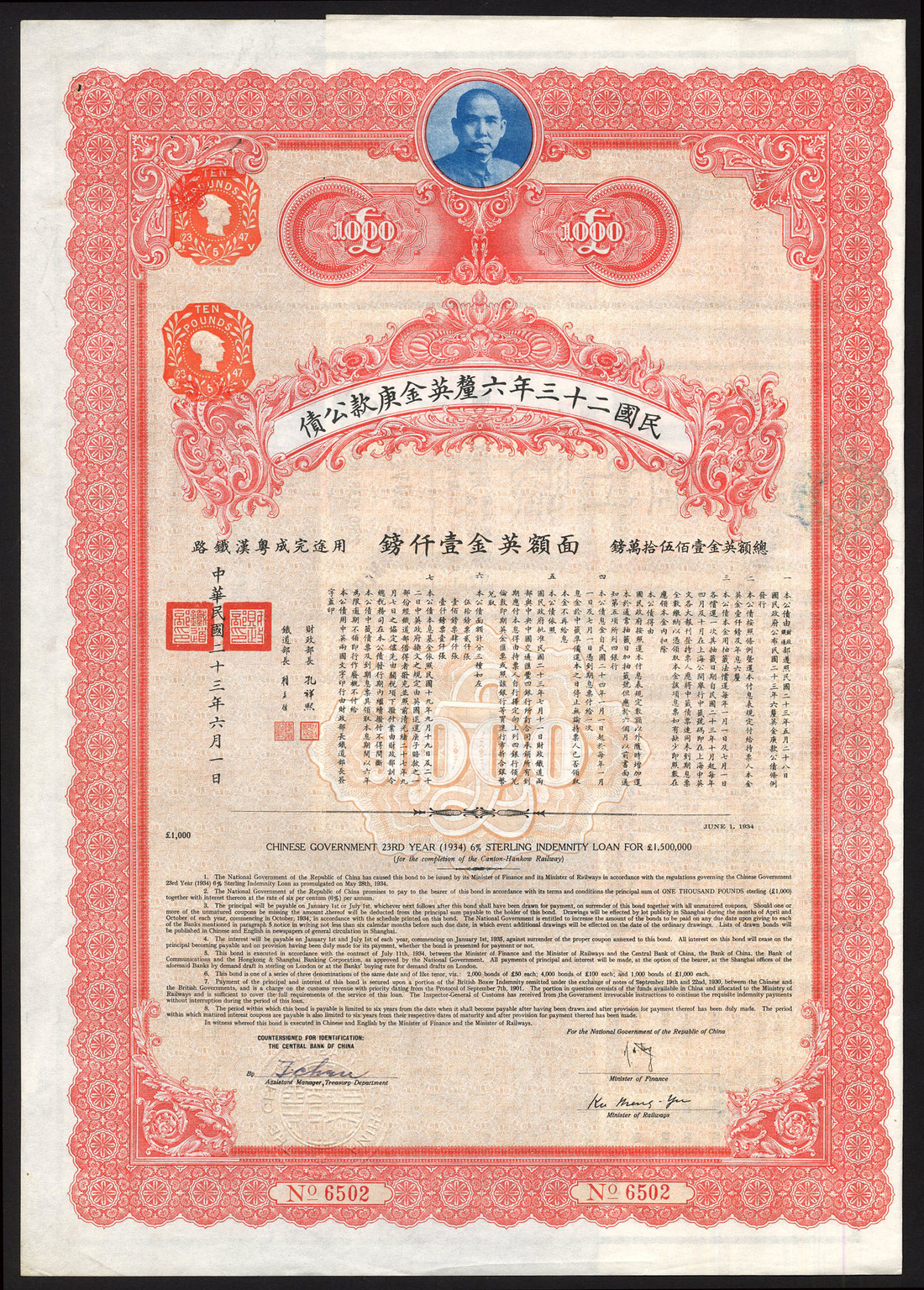 China: 1934, 6% Sterling Indemnity Loan, bond for £1000, no. 6502, portrait of Sun Yat Sen at top, text in Chinese and English, red and blue, pink underprint, with coupons, about extremely fine. [R7*]