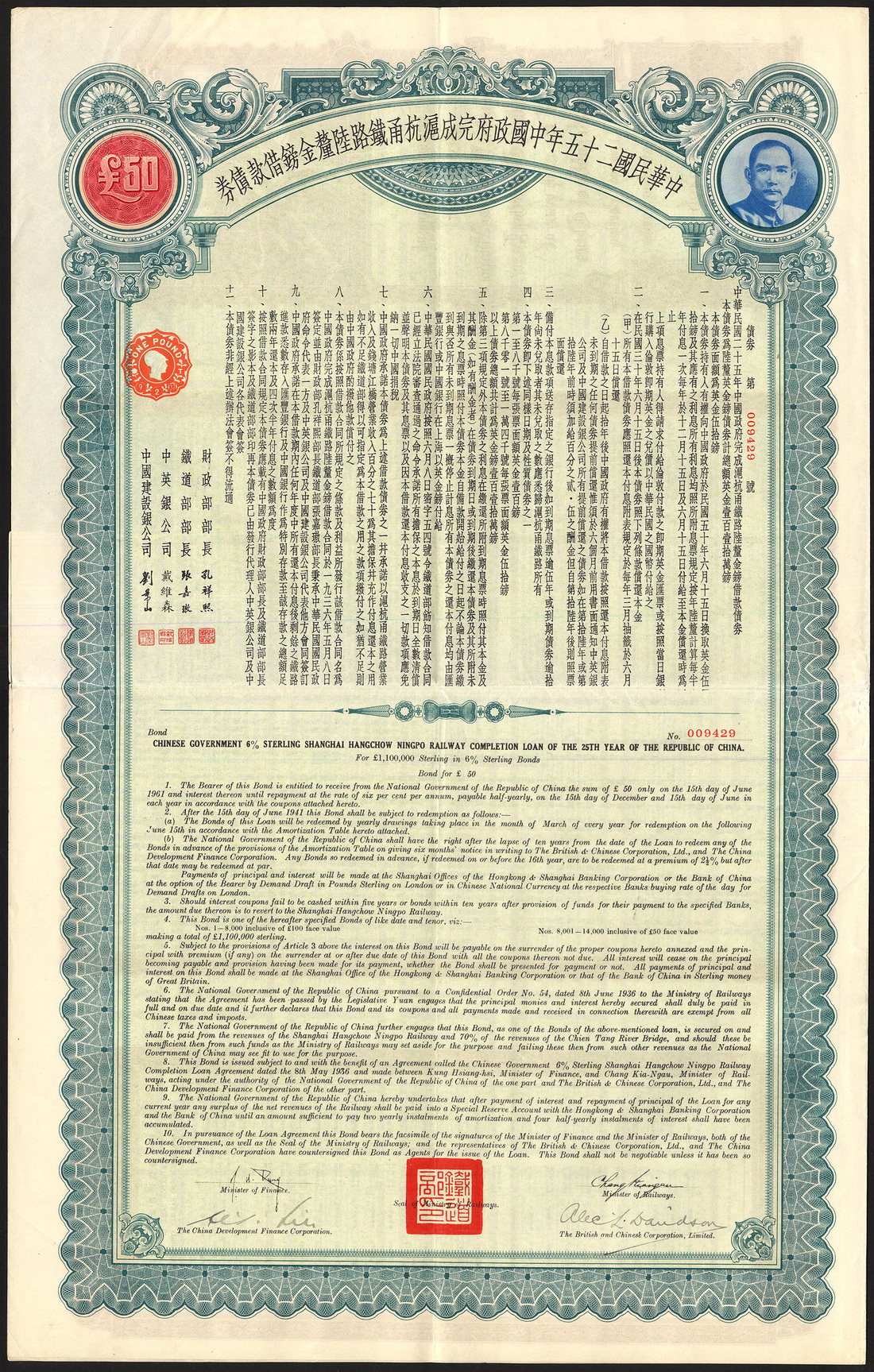 China: 1936, 6% Shanghai-Hangchow-Ningpo Railway Completion Loan, pair of bonds for £50 and £100, large format pieces with Sun Yat Sen top right, ornate borders, green, red and blue and brown, green and blue respectively, with coupons, extremely fine (2)