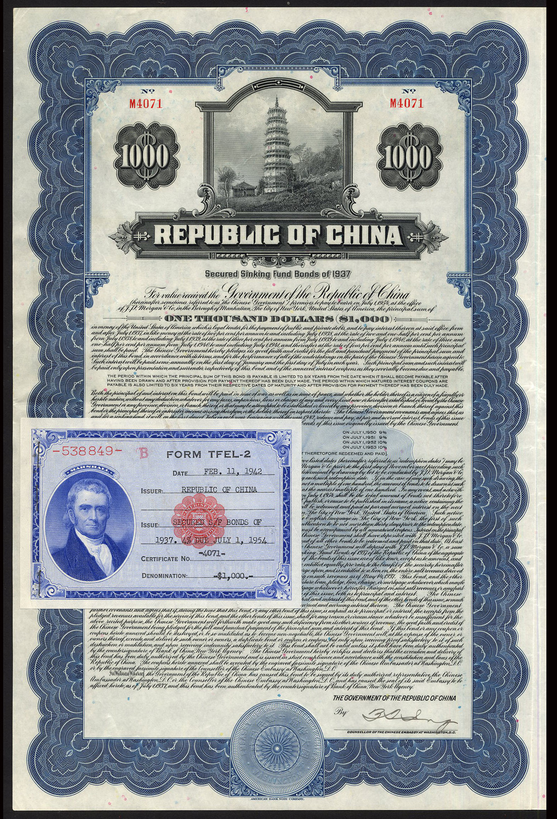 China: 1937 Secured Sinking Fund Bond (Pacific Development Loan), bond for US$1000, no.M4071, pagoda at top, blue and black, with coupons, ABNCo. printing (K.952) with Form TFEL-2 attached,, extremely fine. [R5*]
