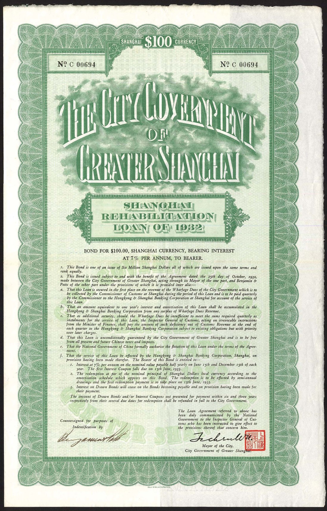China: City Government of Greater Shanghai, 7% Shanghai Rehabilitation Loan, 1932, bond for $100 (Shanghai currency), no.C00694, large format piece with ornate borders, green and black, text all in English, with coupons, good very fine.