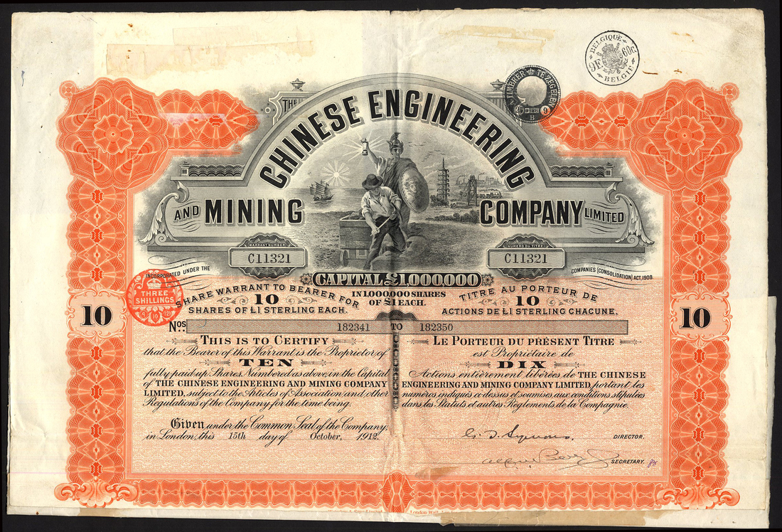 China: Chinese Engineering and Mining Co. Ltd., 10 shares of £1, London 19[12], no.C11321, capital £1 million, Britannia stands over miner with pick, orange and black, text in English and French, printed by Waterlow & Sons, with coupons, some remains of paper endorsements, bottom edge a little uneven, good very fine.
