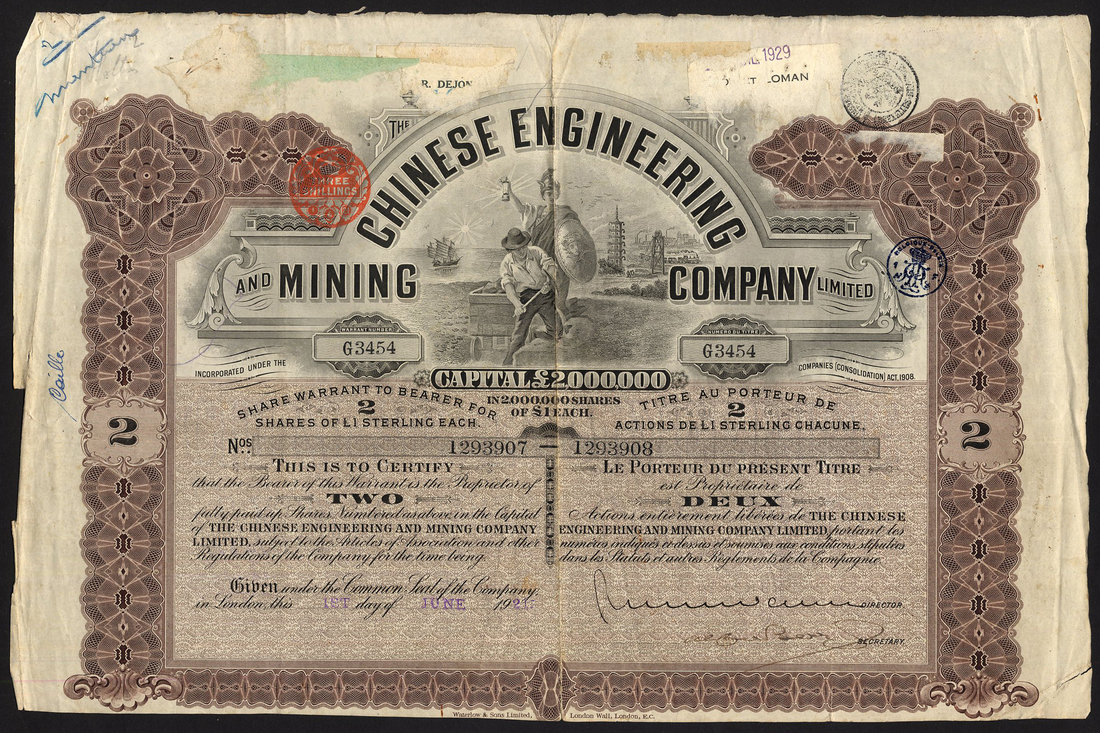 China: Chinese Engineering and Mining Co. Ltd., 2 shares of £1, London 19[21], no.G3454, capital £2 million, Britannia stands over miner with pick, brown and black, text in English and French, printed by Waterlow & Sons, no coupons, couple of edge tears, some remains of paper endorsements, good fine.
