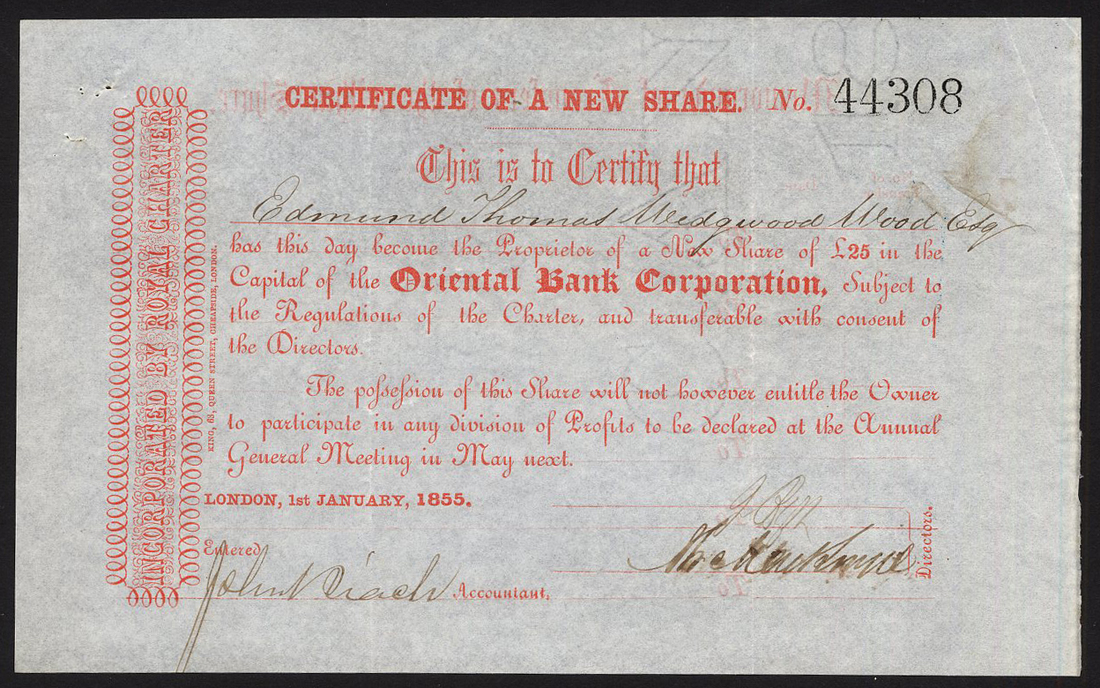 China: Oriental Bank Corporation, £25 'new' share, London 1855, no.44308, small format piece, red, very fine and very scarce type. [R9]