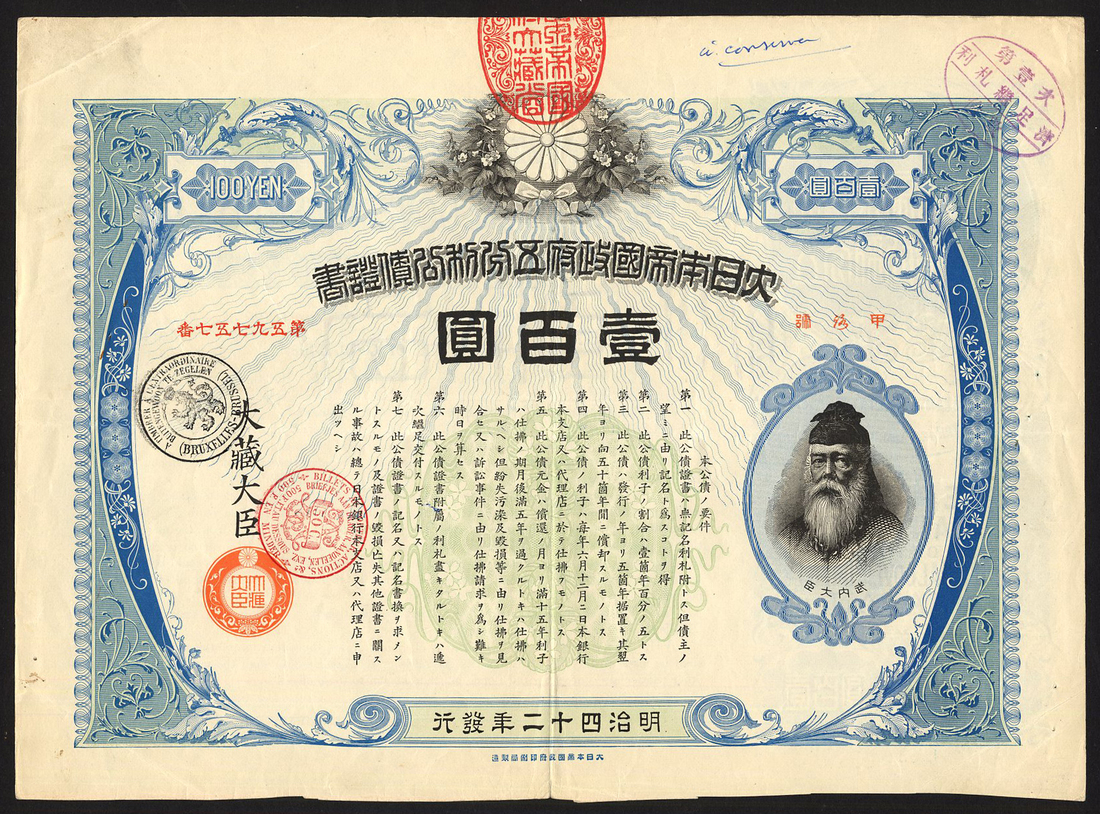 Japan: Imperial Japanese Government, 5% Loan, 1909, bond for 100 yen, Mark 'Ko-Ro', no.59757, vignette of Takeuchi Sukune at right, very ornate border, text in Japanese on front with English translation on reverse, blue & black, no coupons, very fine.