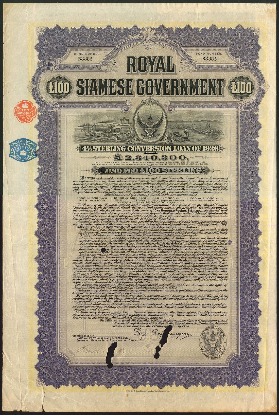 Thailand: Royal Siamese Government, 4% Sterling Conversion Loan of 1936, bond for £100, no.B8885, large format piece with coat of arms flanked by speeding steam train and rice field, mauve and black, printed by Waterlow & Sons, with coupons, a few cancellation holes, a little creased, tear at bottom edge (40mm), very fine.
