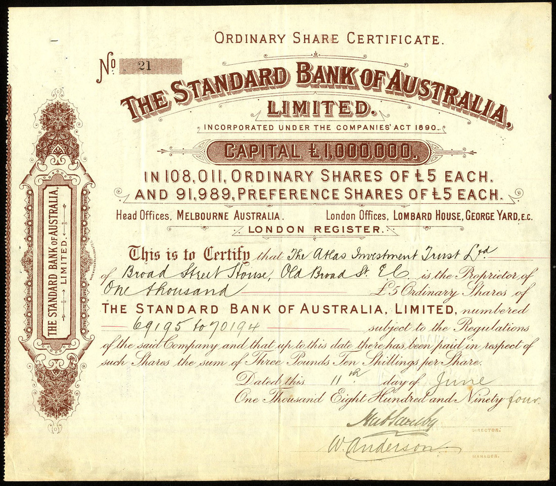 Australia: Standard Bank of Australia Ltd., £5 ordinary shares, London register 189[4], £3 10 shillings paid, #21, scrollwork at left, brown, good very fine.