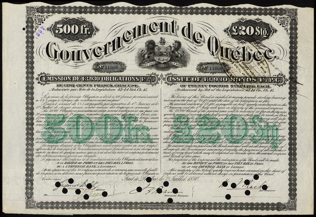 Canada: Government of Quebec, 4½% Loan, 1880, a group of 4 bonds for 500 francs or £20, Quebec 1880, coat of arms in centre, black with green '500 Frs' and '£20Stg' in centre, text in French and English, hole cancels through signatures, one has a small ink stain, very fine or better and scarce. (4)