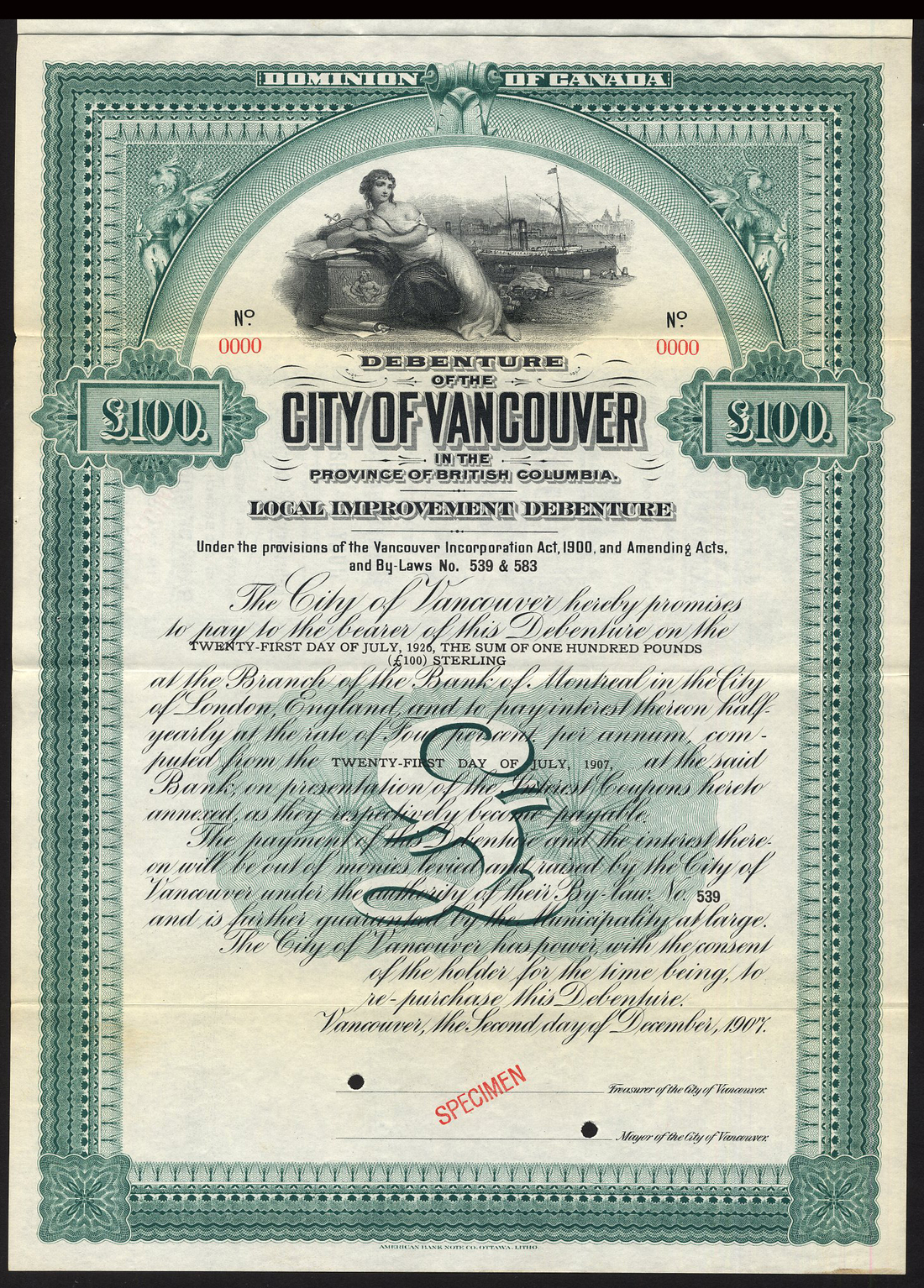 Canada: City of Vancouver, Local Improvements Debenture, a specimen 4% bond for £100, 1907, from the ABNCo. archives, allegorical female with dockside in background, ornate border, green and black, with coupons, numbered 0000 and overprinted SPECIMEN in red, about extremely fine.
