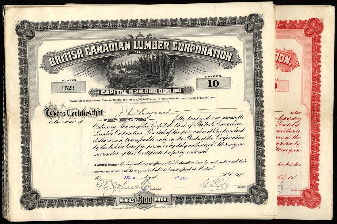 Canada: British Canadian Lumber Corporation Ltd., an attractive group of certificates for 10 ordinary shares, black and 10 preference shares, red, dates range from 1911 to 1912, all with vignette of trees being felled and dragged into the river, printed by Waterlow & Sons, 19 examples of each, very fine to extremely fine. (38)