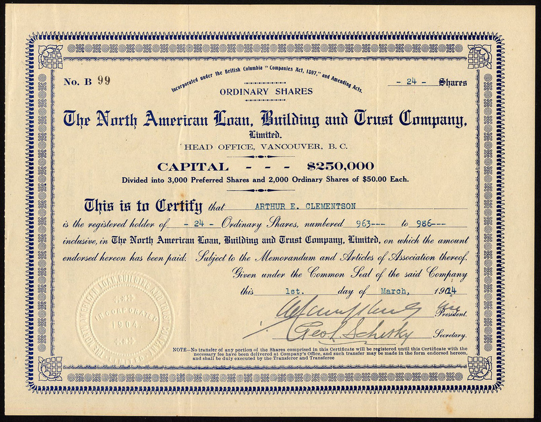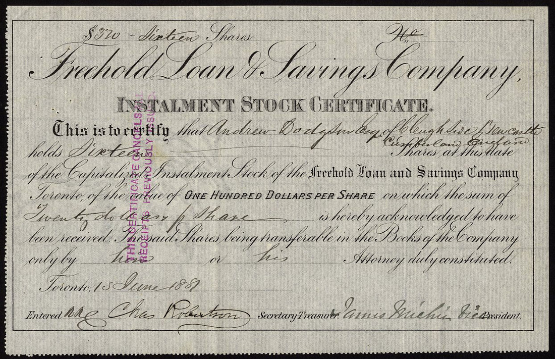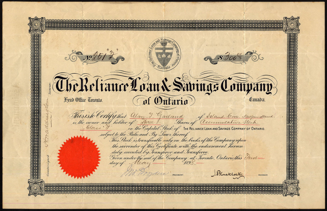 Canada: Freehold Loan & Savings Company, a group of 5 certificates for $100 shares, Toronto [1881], small format, black; together with Reliance Loan and Savings Co. of Ontario, $100 shares, 189[8], coat of arms at top, black, red seal, and a group of 3 certificates of the North American Loan, Building and Trust Co. Ltd., Vancouver, $50 shares, dated 1912 to 1914, ornate border, blue, generally very fine, the first scarce early dates. (9)